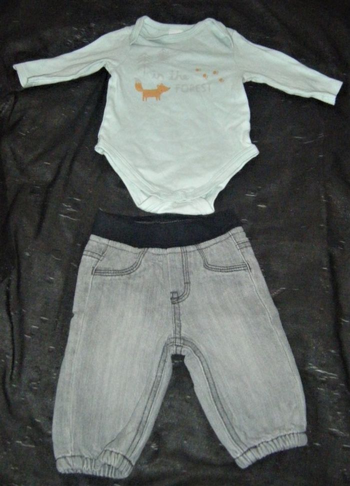 ENSEMBLE 3 MOIS composé d'un body bleu clair C&A et d'un jeans souple KIABI, doublé, large bande élastique à la taille, élastiqué en bas