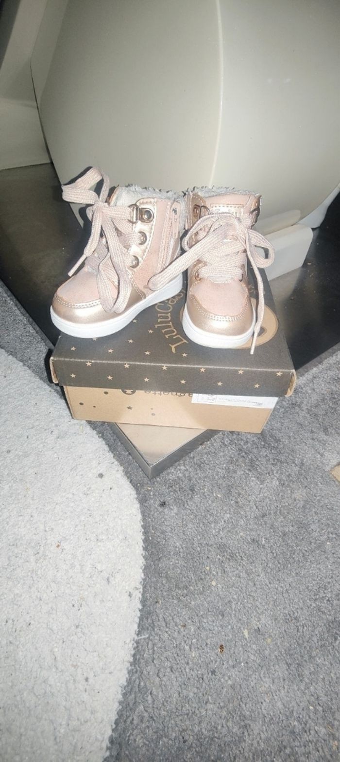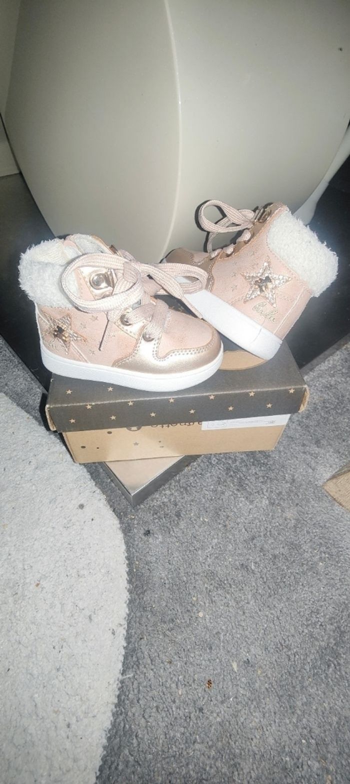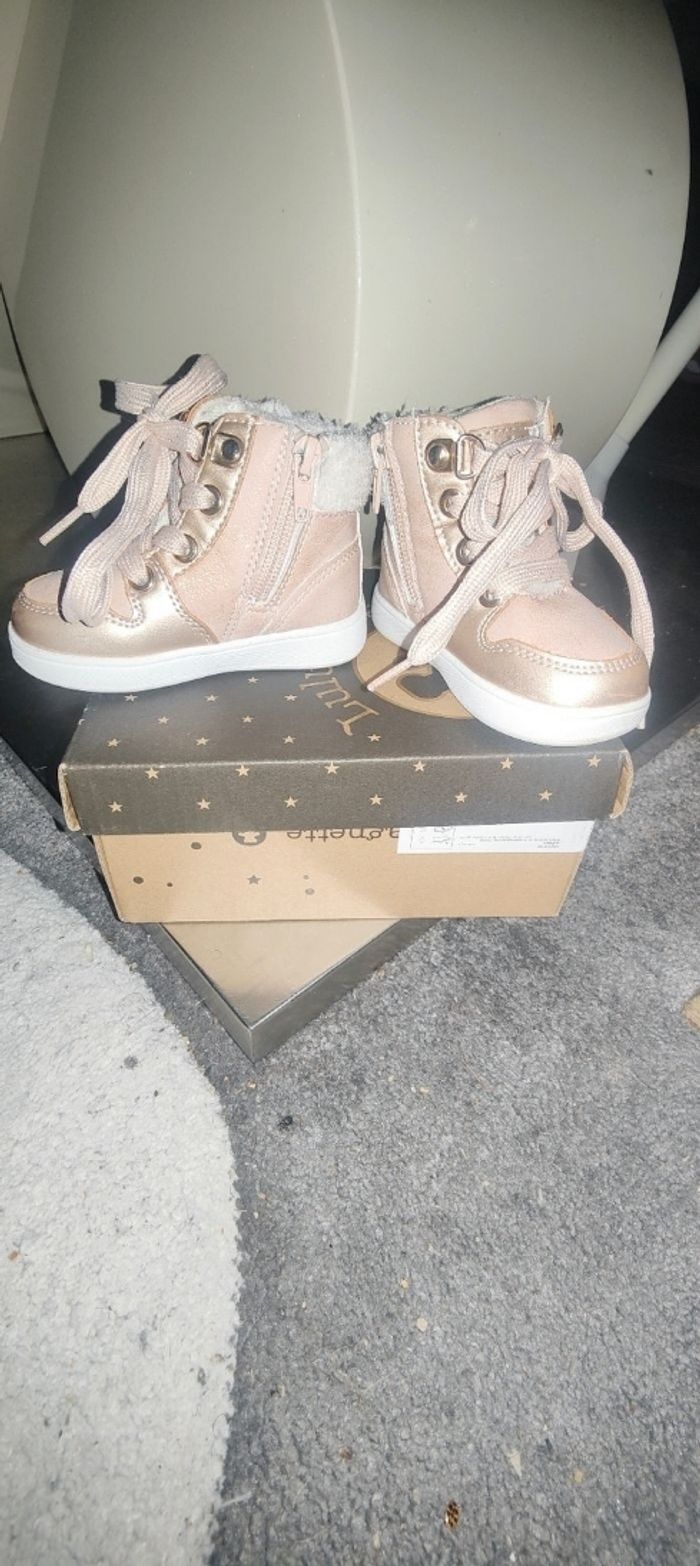 Basket rose pâle/ doré en très bon état Très facile à enfiler grâce à la fermeture éclair T 19