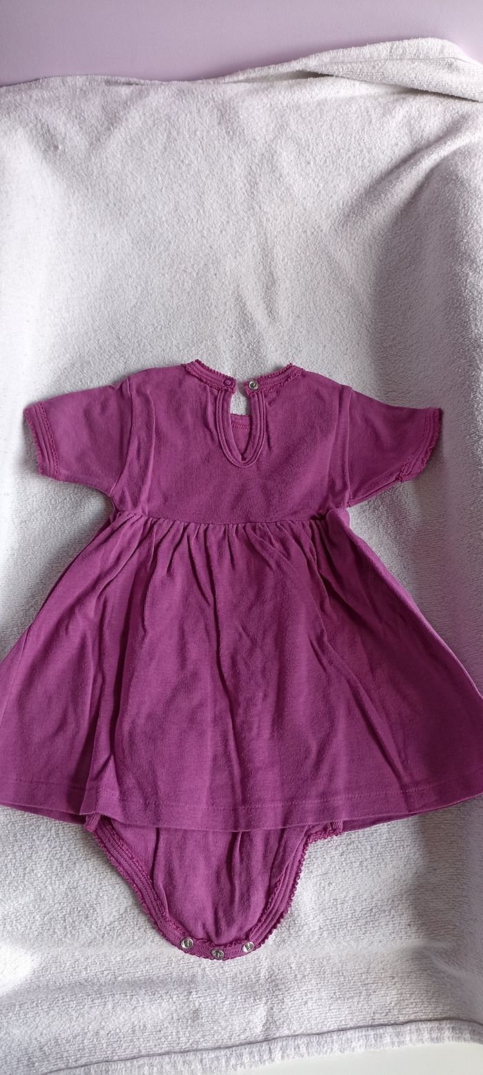 Lot de 4 robes - 2 Obaïbi ( 1 blanche avec motif nœuds et 1 saumon) - 1 DPAM rose fushia - 1 petit bateau violette type body intégré 18 mois
