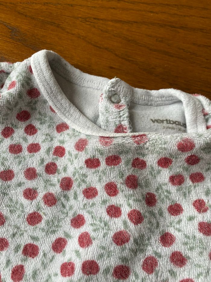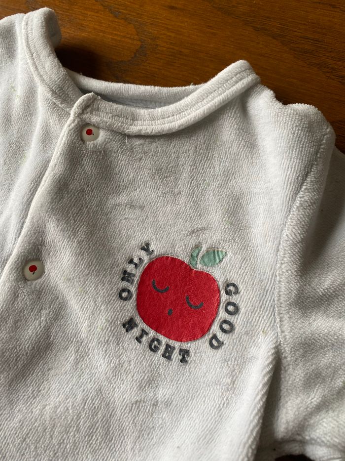 2 pyjamas en velours Verbaudet. Tissus en très bon état. Les motifs du premier avec les petites pommes sont un peu passés au lavage. Pressions devant et entre-jambe très pratiques.