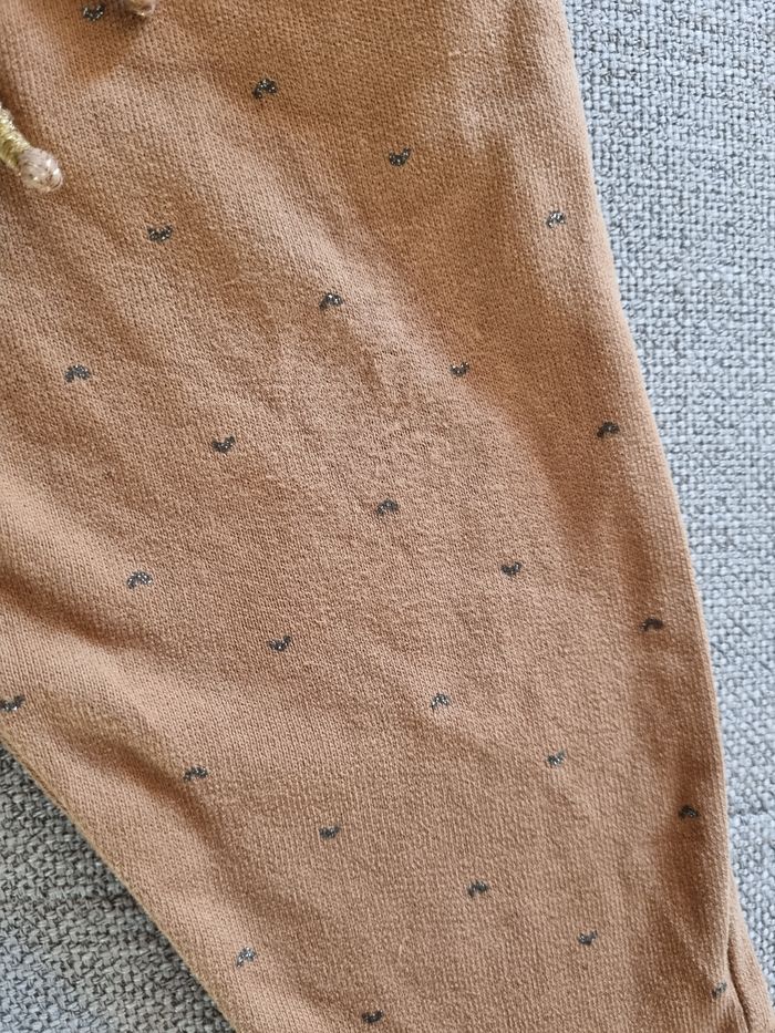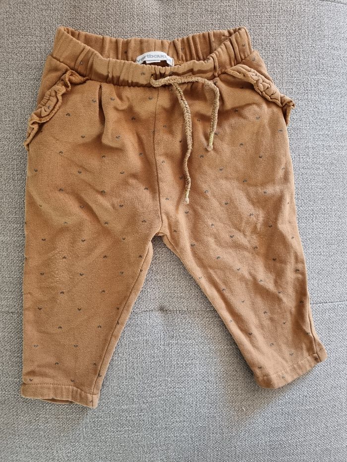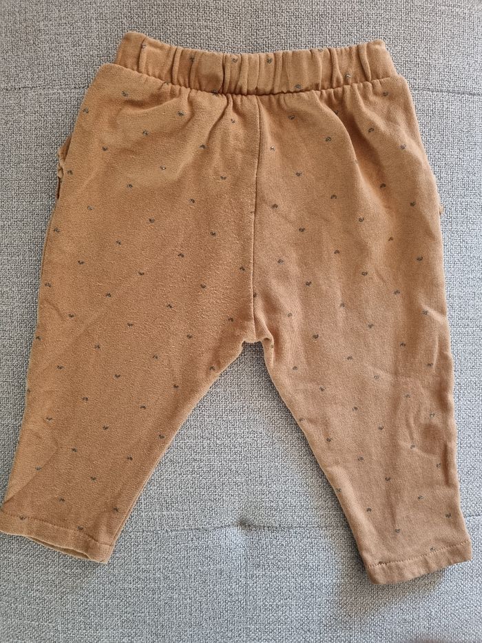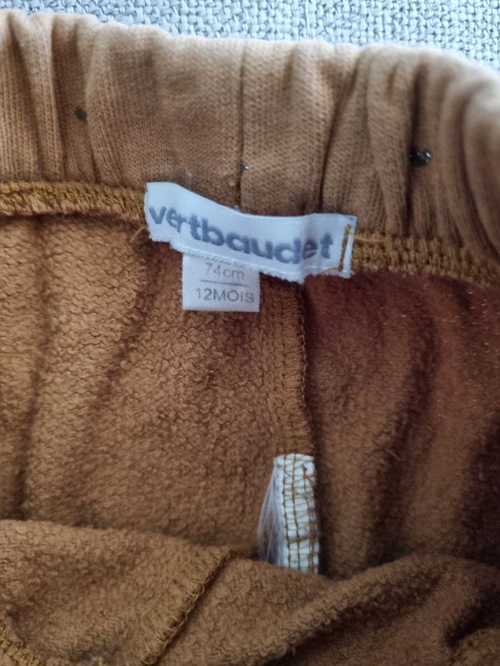 Pantalon Vertbaudet, 12 mois, 74cm. Coloris : marron avec des petits cœurs argentés. Usé au niveau des genoux par le 4 pattes de bébé mais peut encore être porté. (voir la dernière photo)