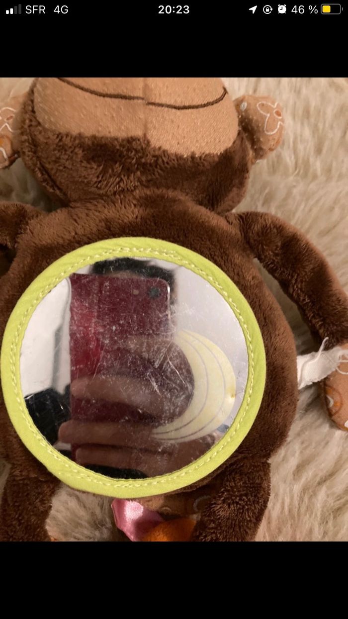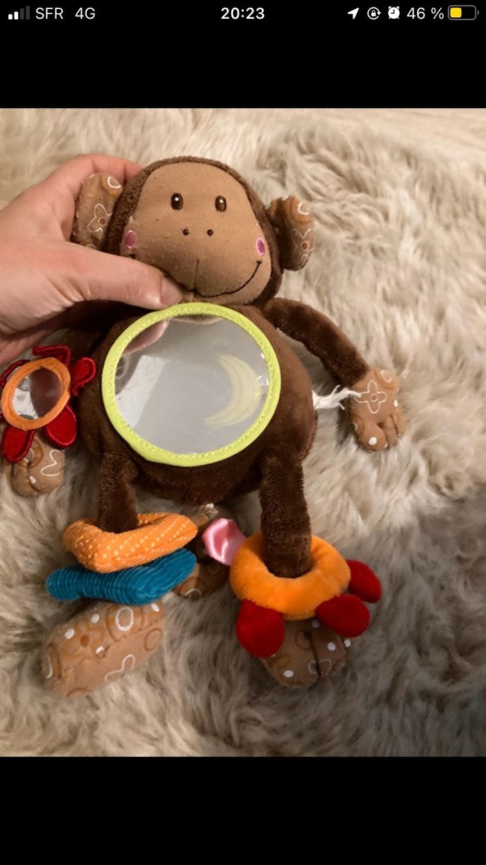Singe d’activité miroir anneau Prénom écrit derrière Miroir un peu rayer mais pas méchant voire les photo Hochet