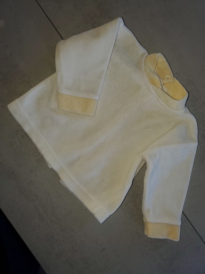 Petit pull,bon état .pression à l'arrière pour ouverture et fermeture taille 1 mois blanc et jaune