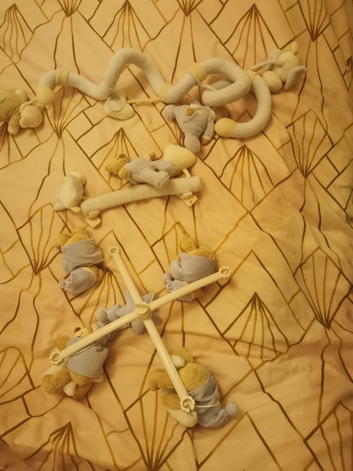 Vends thème ours bleu, beige foncé et clair. Mobile plus pour poussette et tour de parc. 20e