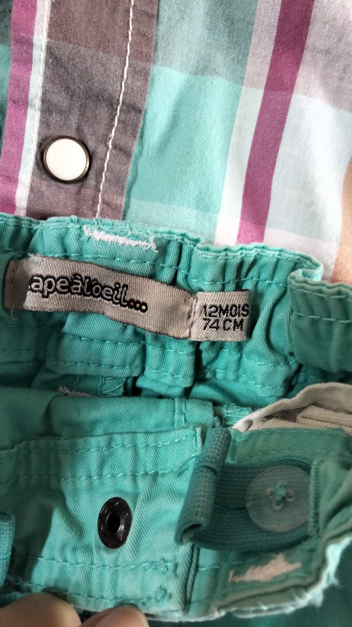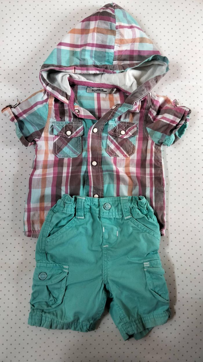 Ensemble comprenant short taille réglable vert eau et chemisette assortie manches courtes avec capuche Tape à l'oeil 12 mois Bon état #jujudugue/12mois