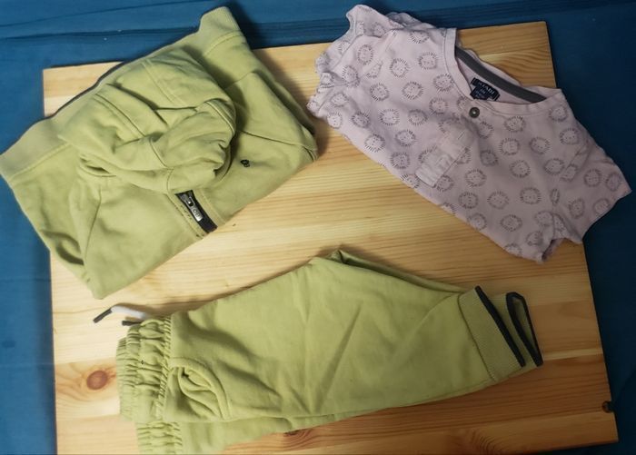 Bel ensemble (4) garçon jogging 6 mois composé de : 1 pantalon jogging Obaibi 1 haut jogging Obaibi 1 tee-shirt Kiabi En très bon état