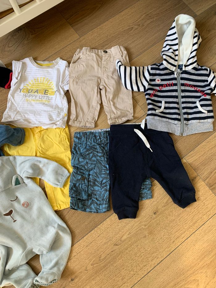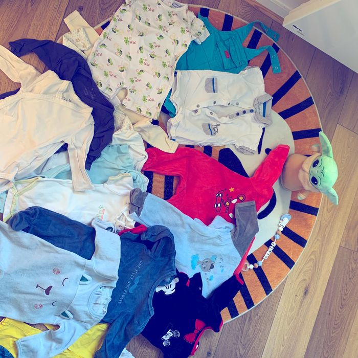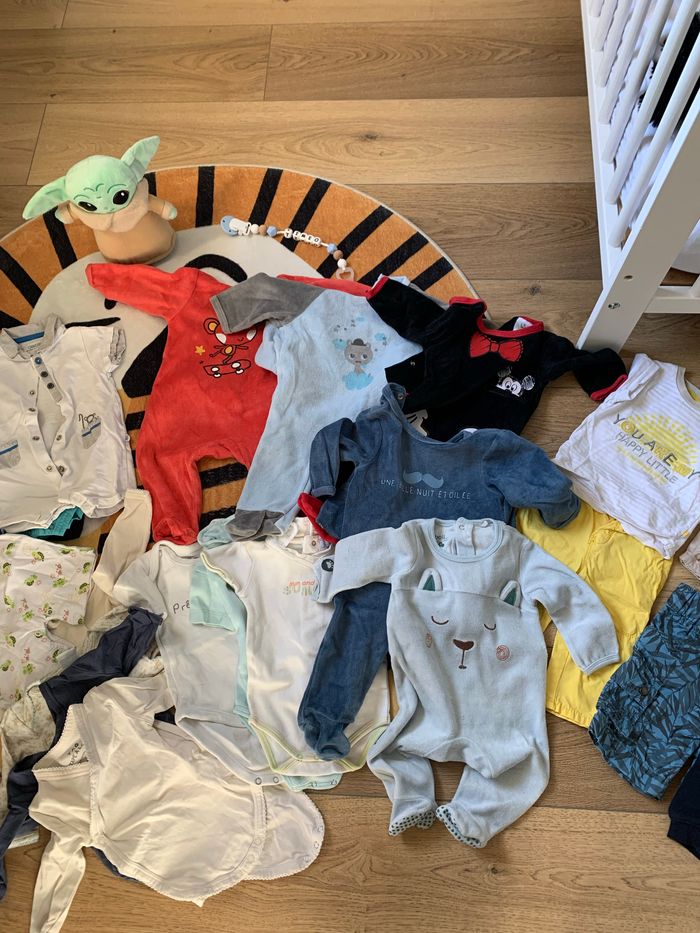 Lot de 5 pyjama en velours 4 pantalon dont un jogging 1 t-shirt manche courte 1 veste assez chaude 2 combinaison 1 salopette 4 bodies manche long 3 bodies manche courte