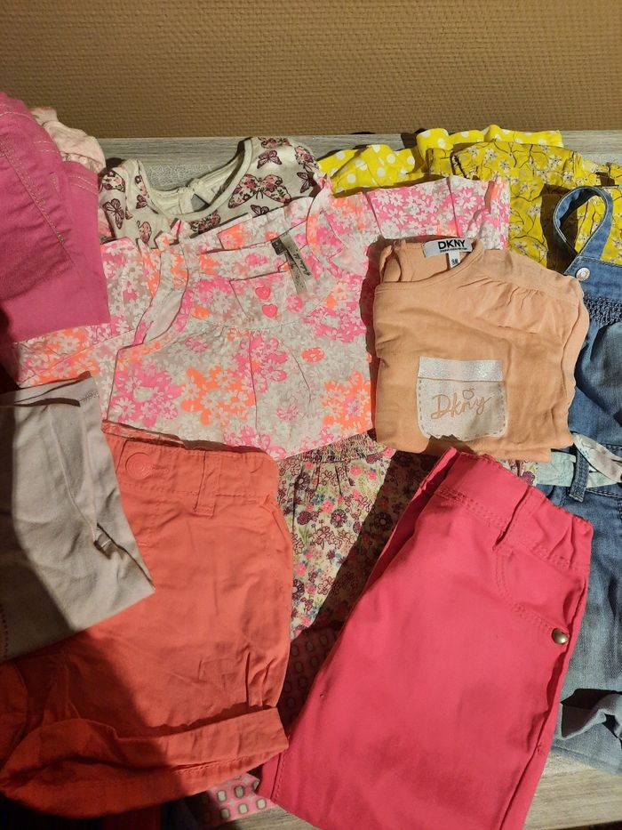 Magnifique lot pour bebe fille 6 mois 1 salopette short, 6 robes, 1 ensemble, 1 short, 2 jupes, 3 pantalons, 1 combishort, 1 bodies manches courtes, 2 t shirts, 2 blouses, 1 chemisier, 1 maillot neuf Soit 22 pieces en tb etat general Marques : dkny, ikks, obaibi, jbc, buissoniere, petit bateau,....
