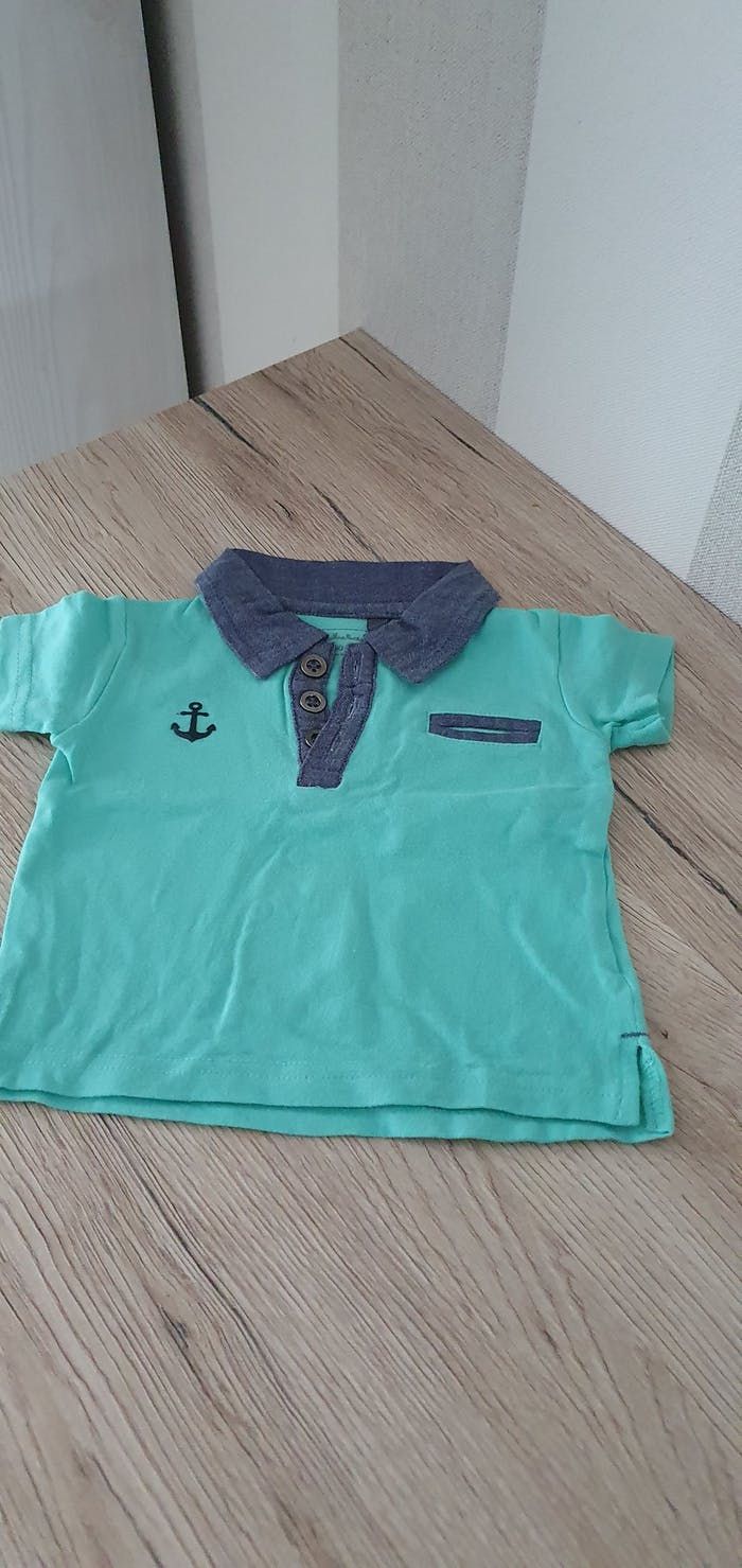 Tee-shirt forme polo manches courtes garçon 👦 Vert clair encolure bleue Marque boîte à malice Maison non fumeur Linge lavé avec lessive bébé