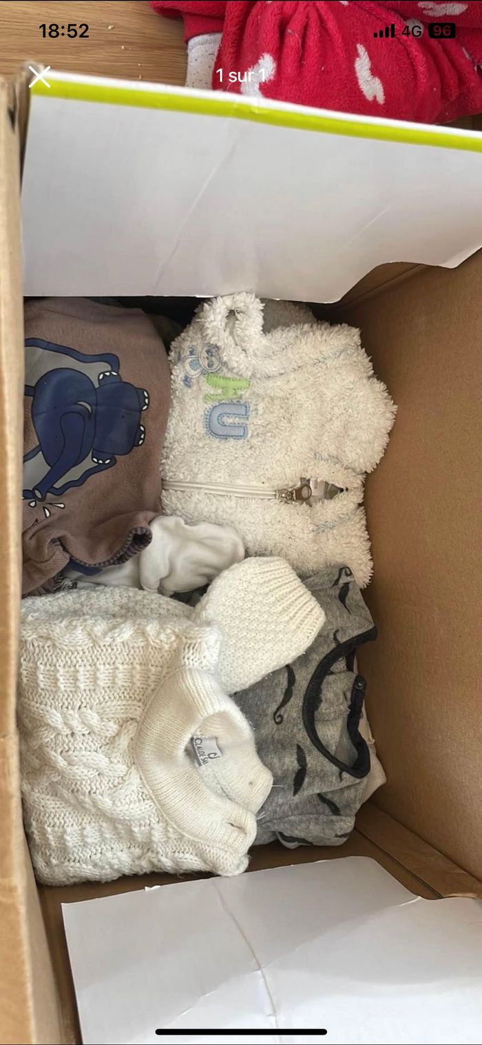 Bonjour je vend un carton d’habille garçon il est composée de 1 mois 3 mois et 6 mois très bonne état