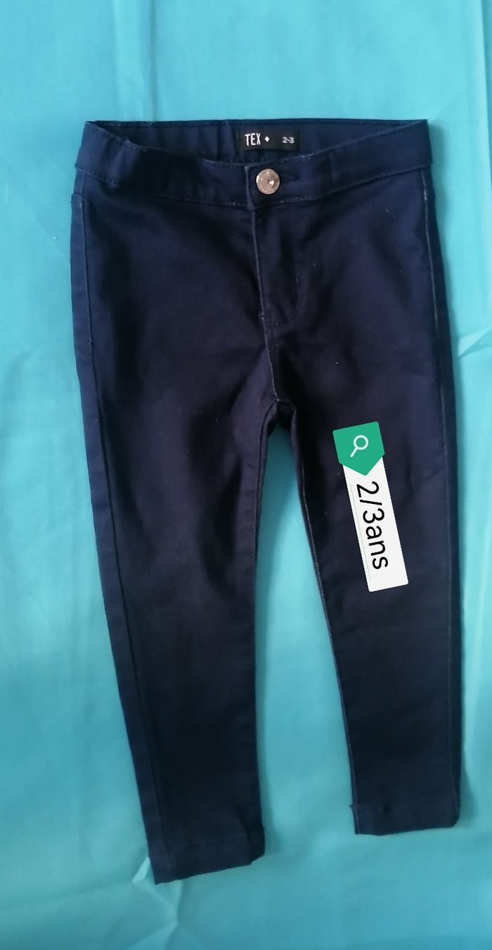 Pantalon filles tex 2/3ans. Bleu marine. taille réglable. 2 poches derrière. 65%coton. 33%polyester. 2%elasthane. Jamais porté. 5€