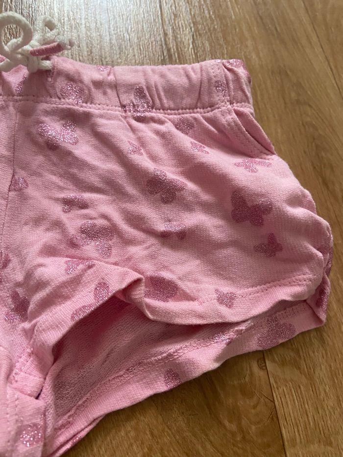 Je vends ce short rose imprimé papillons à paillettes. Coton