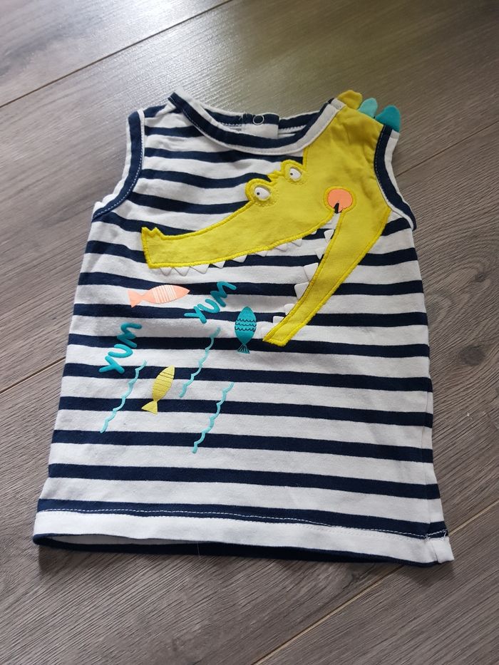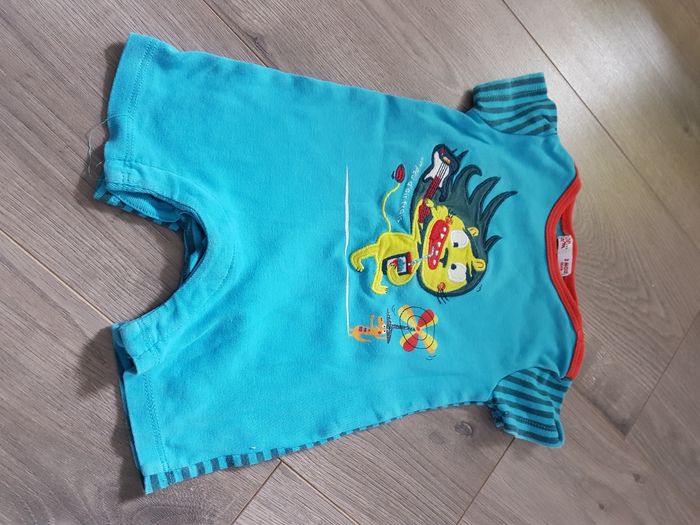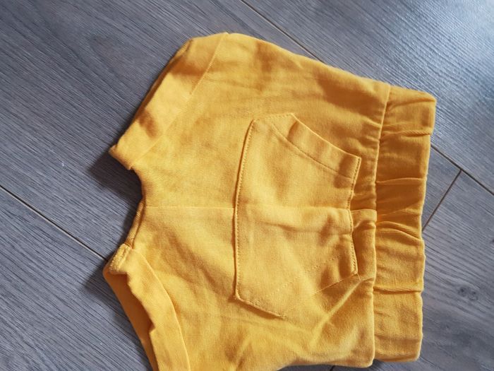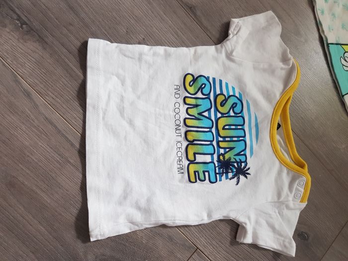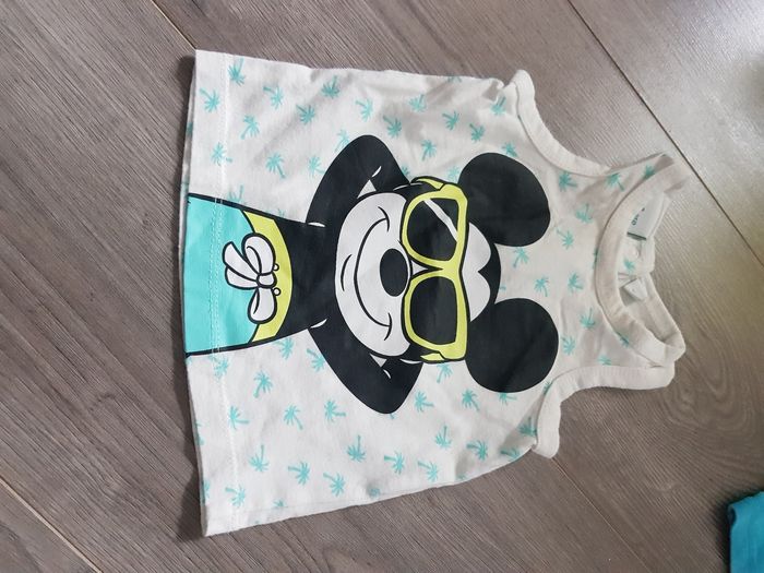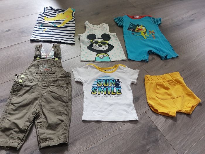 Lot de 6 vetements compose de : Un debardeur sans manches rayé marine de marque orchestra Un tee shirt a manches courtes blanc de marque z Un short jaune de la marque orchestra Un combishort turquoise de la marche du pareil au même Un debardeur blanc mickey avec motif palmier de marque disney Une salopette legere kakie de la marque la compagnie des petits Taille 3 mois Saison été