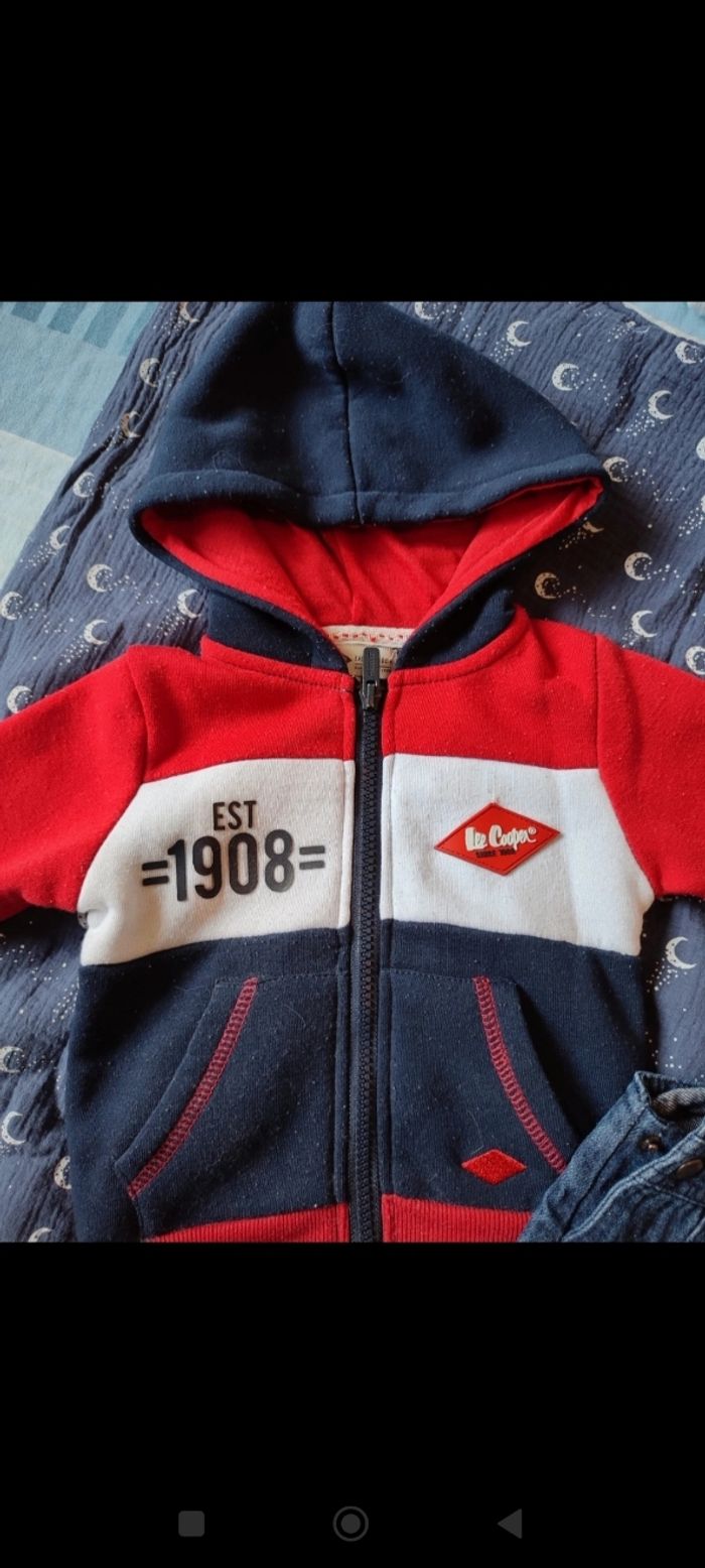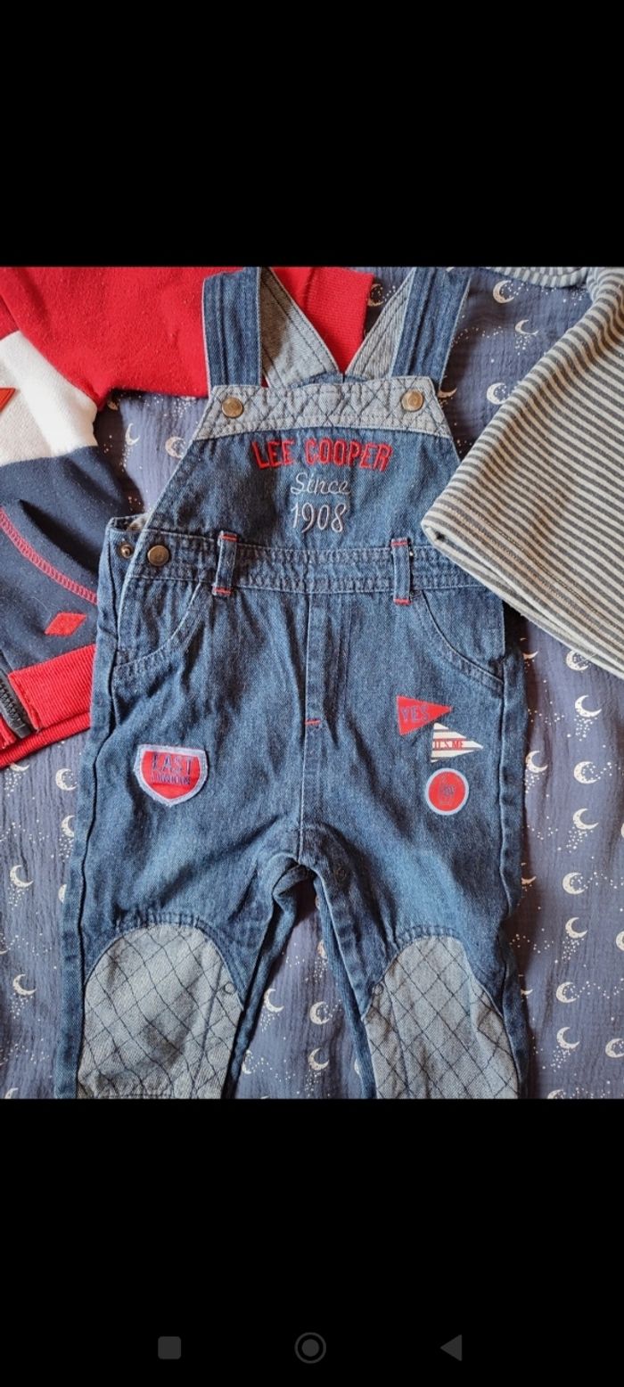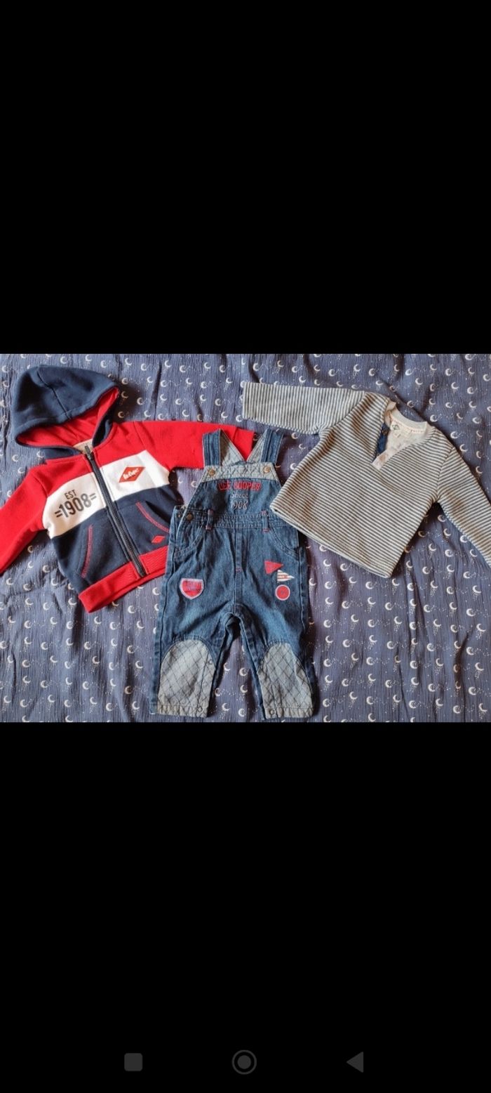 Ensemble salopette en jean, pull et veste à capuche Porté une fois, lavé et la veste est bouloché sinon pas de trou , pas de tâches