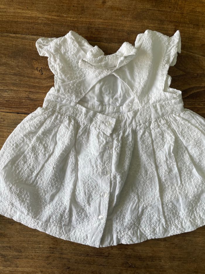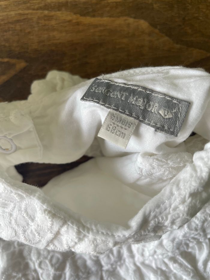 Robe de cérémonie sergent major 6mois En broderie anglaise, boutonnée dans bas du dos, haut du dos ouvert avec noeud décoratif qui se ferme par pression. Bas de la doublure en tulle Détails très fins Culotte assortie 6mois 68cm Jamais portée juste lavée, étiquette et bouton de rechange à l’intérieur. Encore vendu sur sergent major à 35,99€ Maison non fumeur et sans animaux