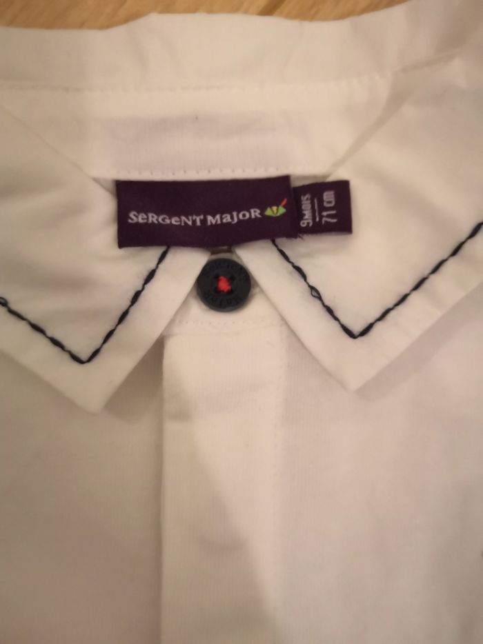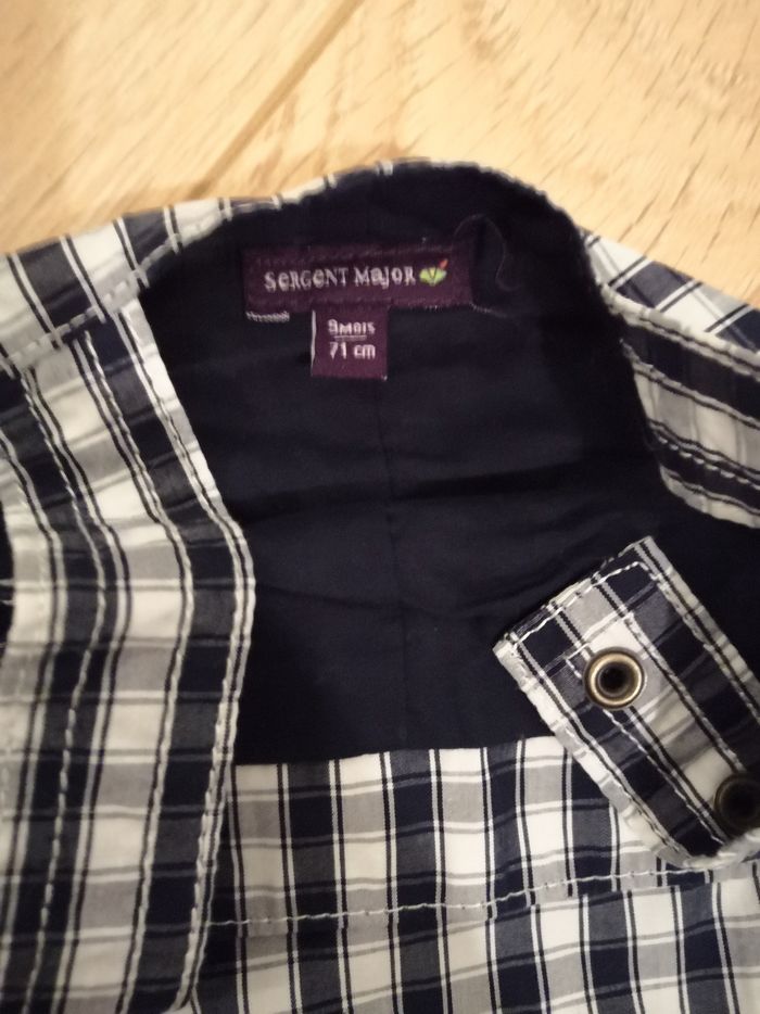 Ensemble tshirt + salopette sergent Major 9 mois Jamais porté, neuf Salopette à carreaux marine et blanc Polo blanc avec scène de la vie au bord de mer (phare /bateau / poisson / vague )