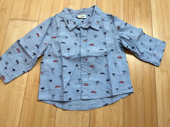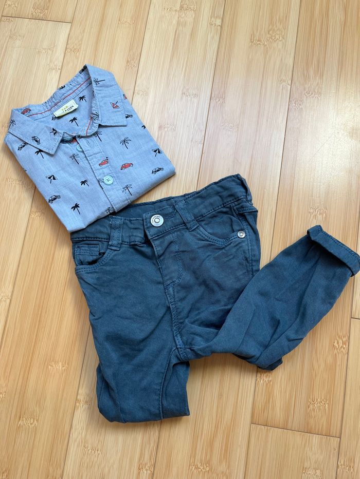 Tenue composée d’une chemise et d’un jean bleu marine en taille 6 mois. En très bon état.