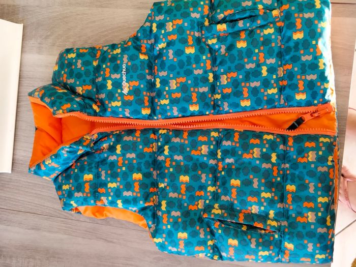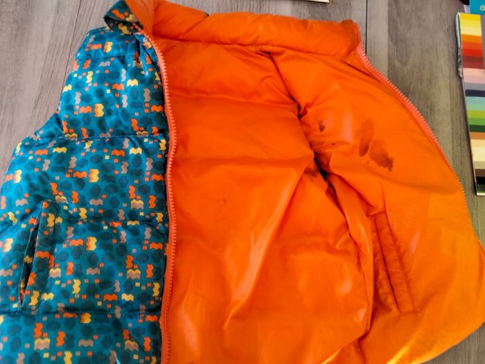 Doudoune réversible mais tachée à l'intérieur. Ne se voit pas sur l'extérieur. Très bon état sinon Taille 4/5 ans