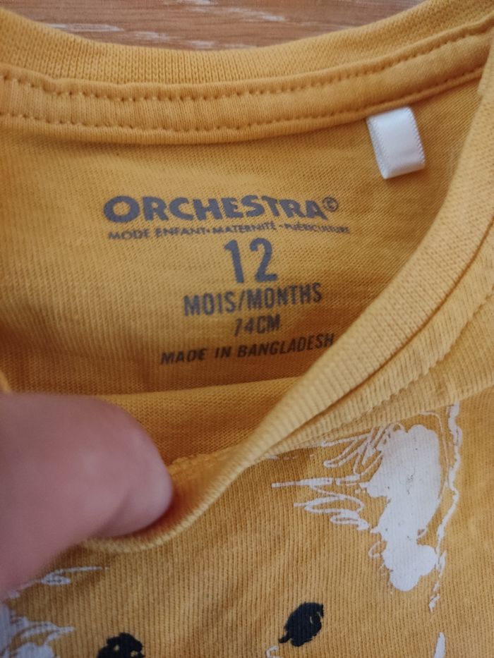 Tee-shirt manches longues en excellent état, guère porté. Marque Orchestra. Taille 12 mois.