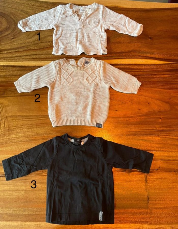 Vend lot de 7 articles de 6 mois Tee-shirts manche longue 1 : tape à l’œil 2 : tape à la (pull) 3 : kitchoun Pantalon 1 : kiabi 2 : Z 3 : kiabi Gilet Z