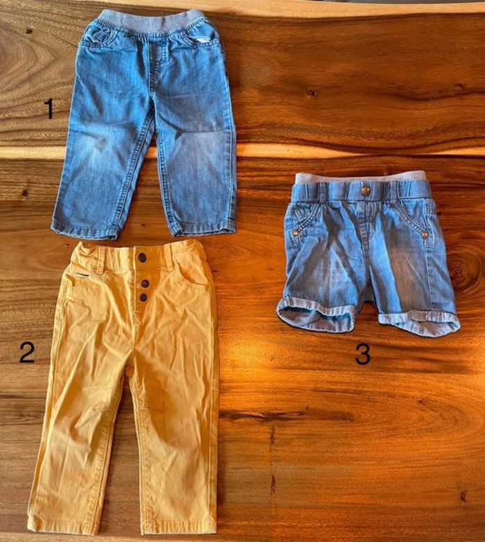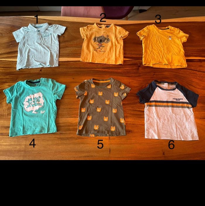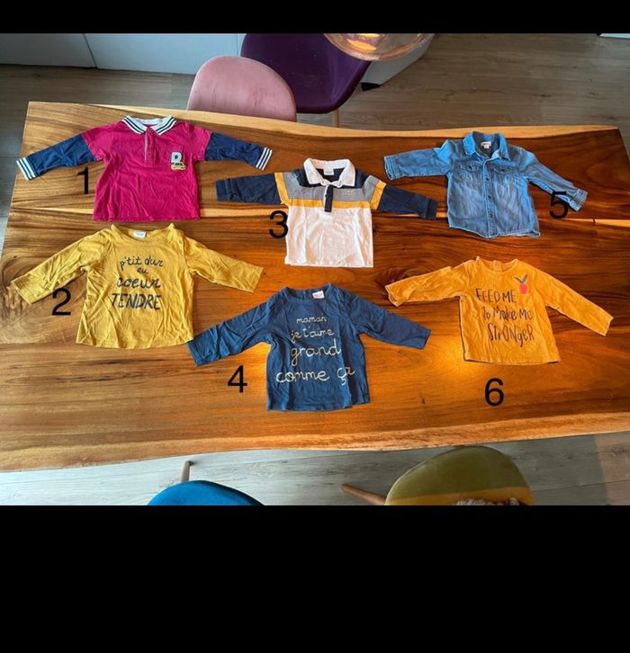 Vend lot de 16 articles de 18 mois Tee-shirts 1 : boîte à malices 2 : kiabi 3 : C&A 4 : Z 5 : C&A 6 : C&A Tee-shirts manche longues 1 : DPAM 2 : tape à l’œil 3 : tape à l’œil 4 : tape à l’œil 5 : liberto (chemise en jean) 6 : vertbaudet Pantalon 1 : orchestra 2 : tape à l’œil 3 : kiabi Gilet tape à l’œil