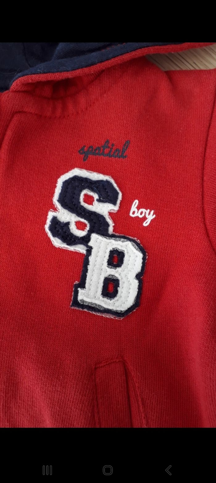 Veste zippé rouge avec capuche et lettres brodé sur le devant. Taille 6 mois