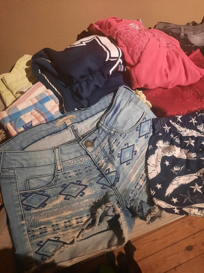 Magnifique lot de 14 vetements Taille xs 14/16 ans Shorts, jupes, jeans, blouse, combishort, robe,.. Marques : superdry, vero moda, jbc, zara,... En tres bon etat