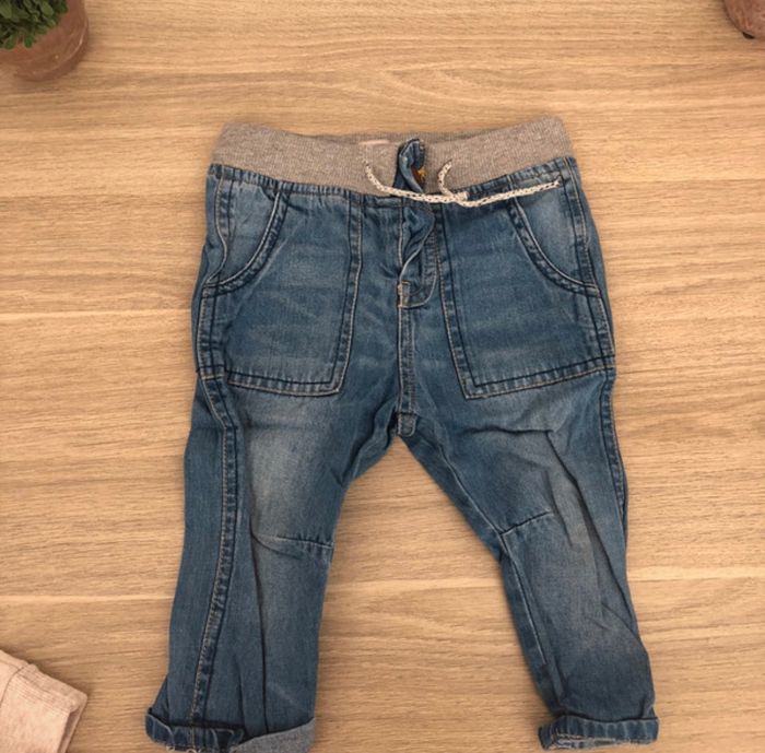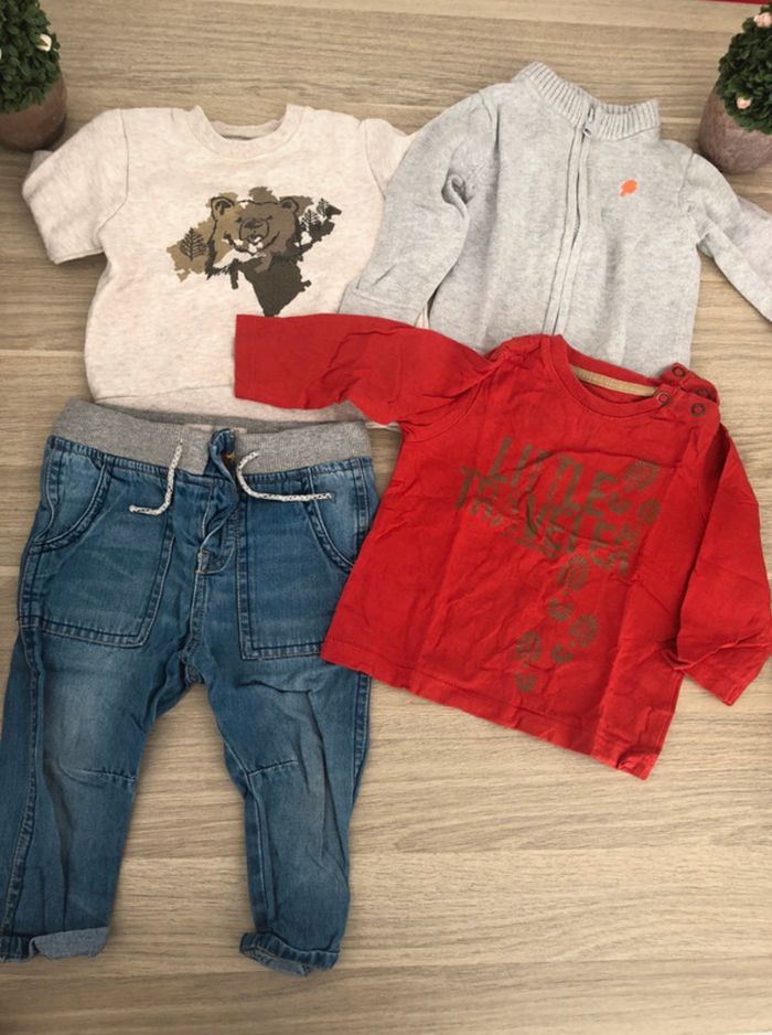 Ensemble qui comprend - un tee shirt manche courte kimbaloo -un gilet Tex -un sweet kimbaloo - un jean 9/12 mois marqué zara