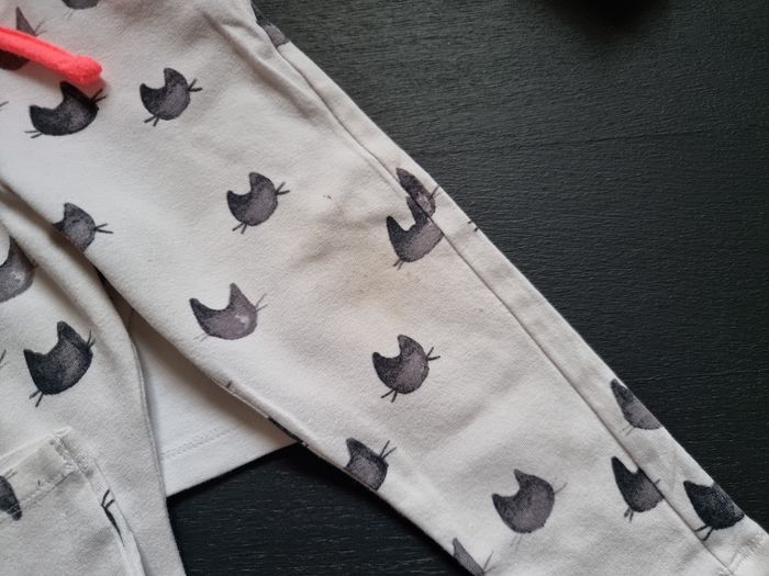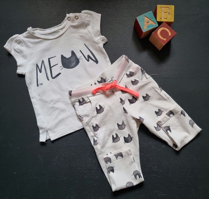 Petit ensemble chat, tee shirt et legging. Porté quelques fois, traces sur les genoux...