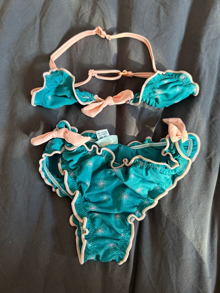 Maillot de bain 2 pieces bleu turquoise et rose pâle légèrement fluo, marque Okaidi, petits noeuds sur hanches et 1 sur poitrine, très bon état peu porté