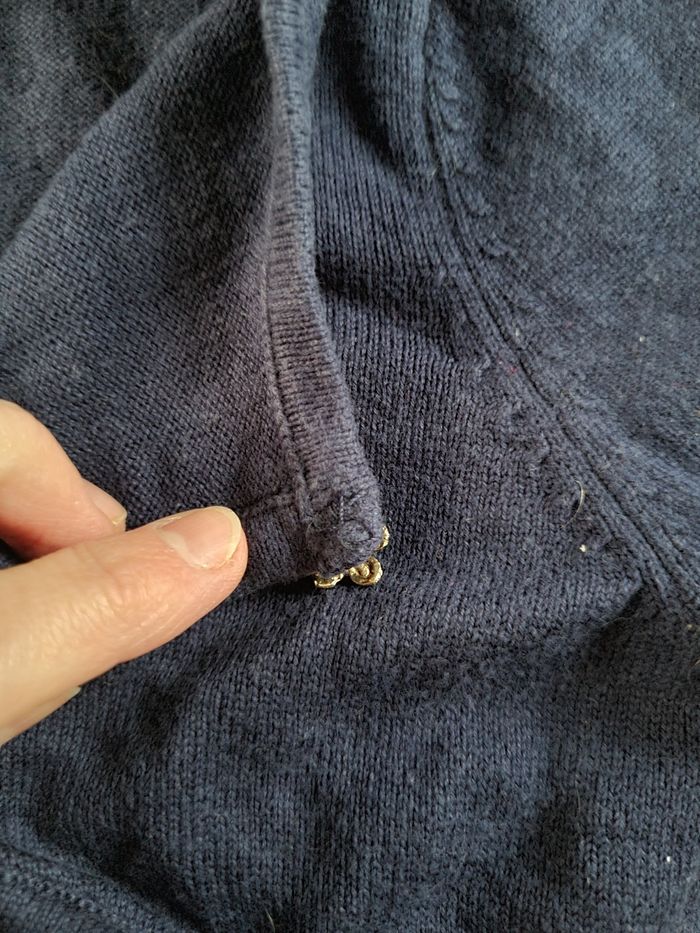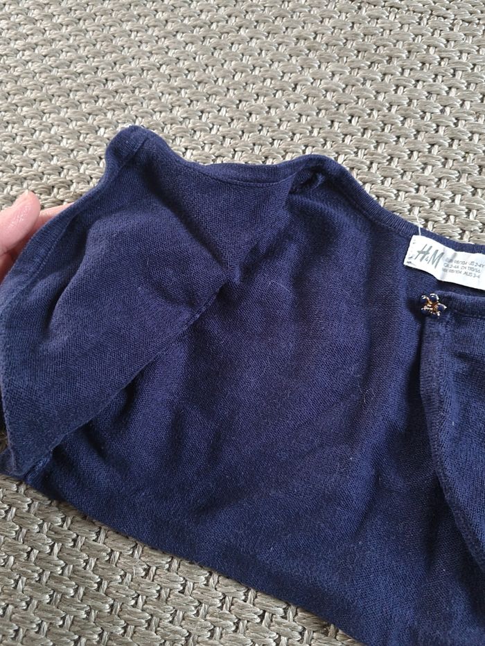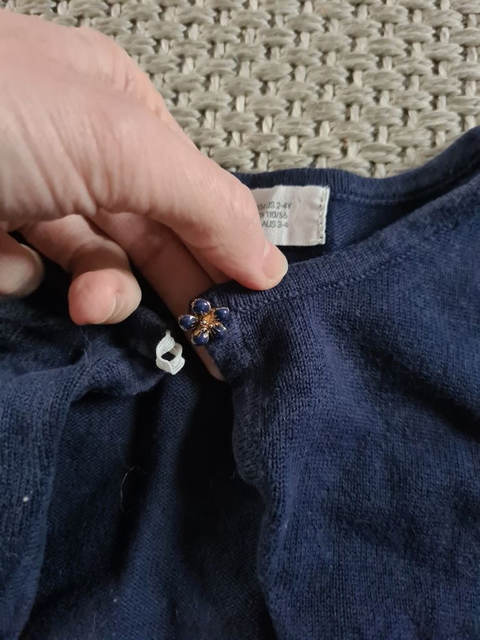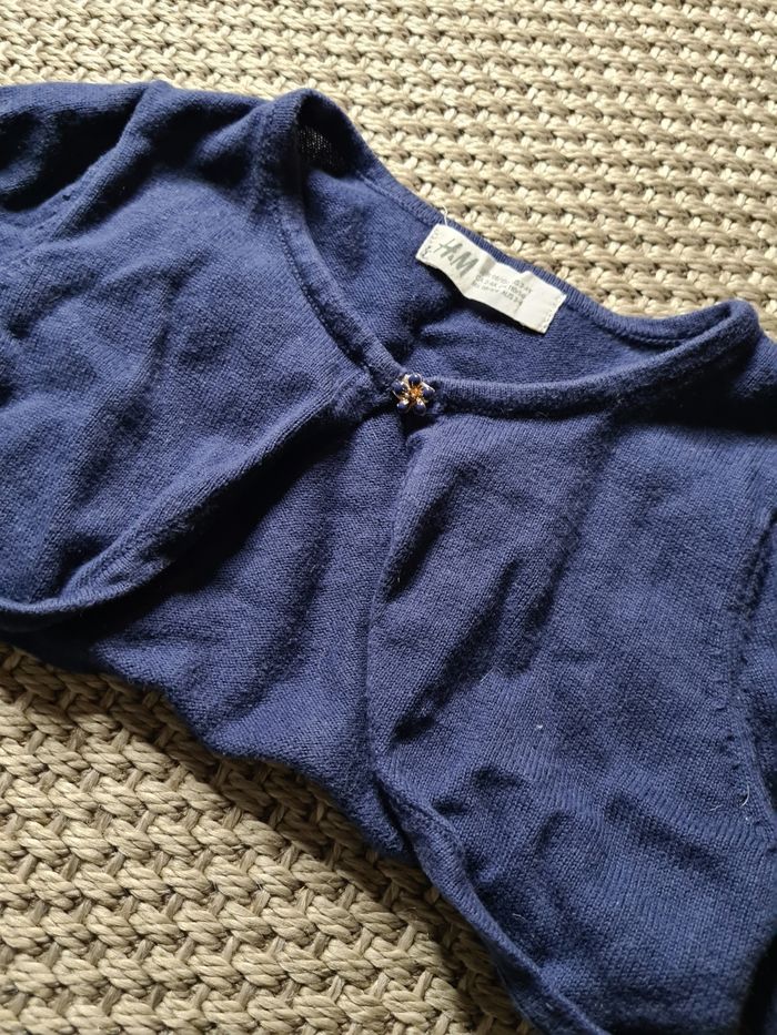 Boléro bleu marine avec bouton fleur. Le bouton fleur à été remplacé car l'ancien était en plastique blanc. Taille 2/4 ans - marque H&M. Peu portée il est en très bon état.