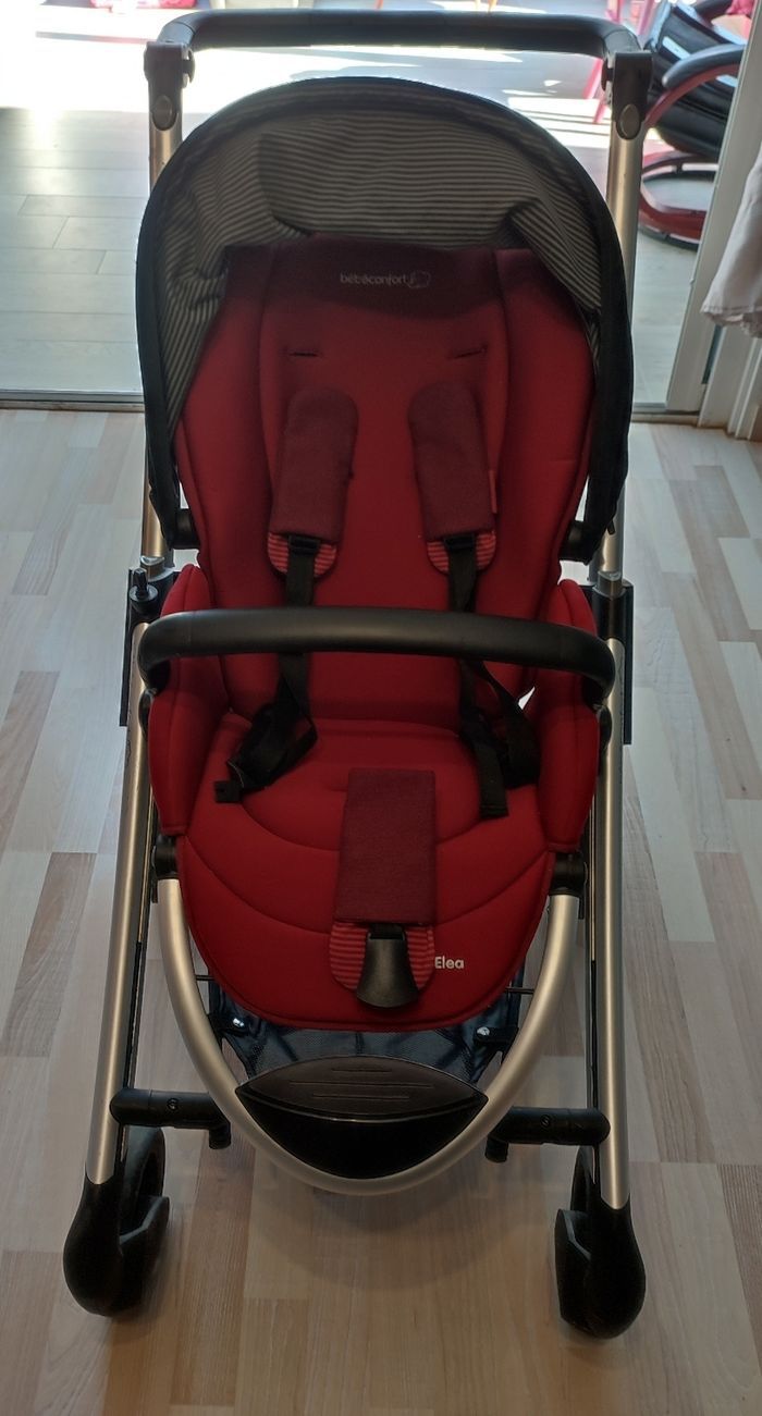 Trio poussette Bébé confort, modele Elea. Cosy, nacelle et hamac. Peuvent se fixer sur la poussette dans les deux sens, face route et face parents. Guidon ajustable en hauteur, hamac avec 2 inclinaisons poussette, panier en dessous, frein à pied. Acheté neuf 690€. Utilisé pour mes 2 filles mais en très bon état. Donne chancelière Bébé Confort utilisé 2-3 fois grand max (acheté 79€). Remise en main propre uniquement (44)