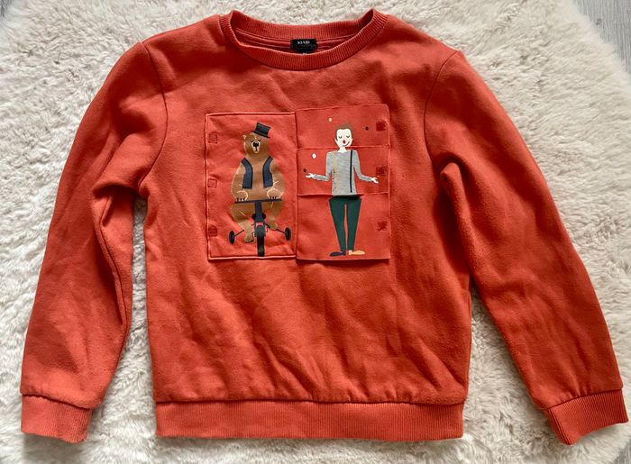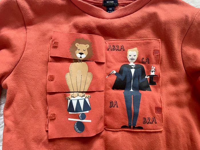 Sweat de la marque Kiabi Taille 8 ans Couleur orange Thème du cirque Présence de petites bouloches Occasion, bon état
