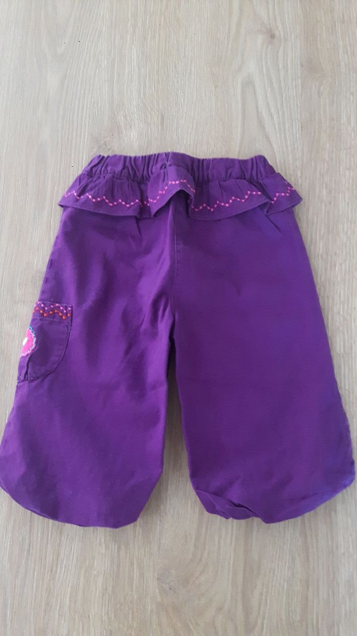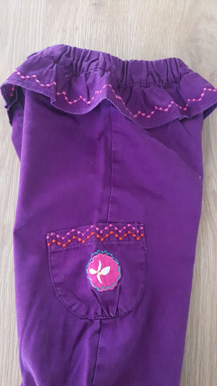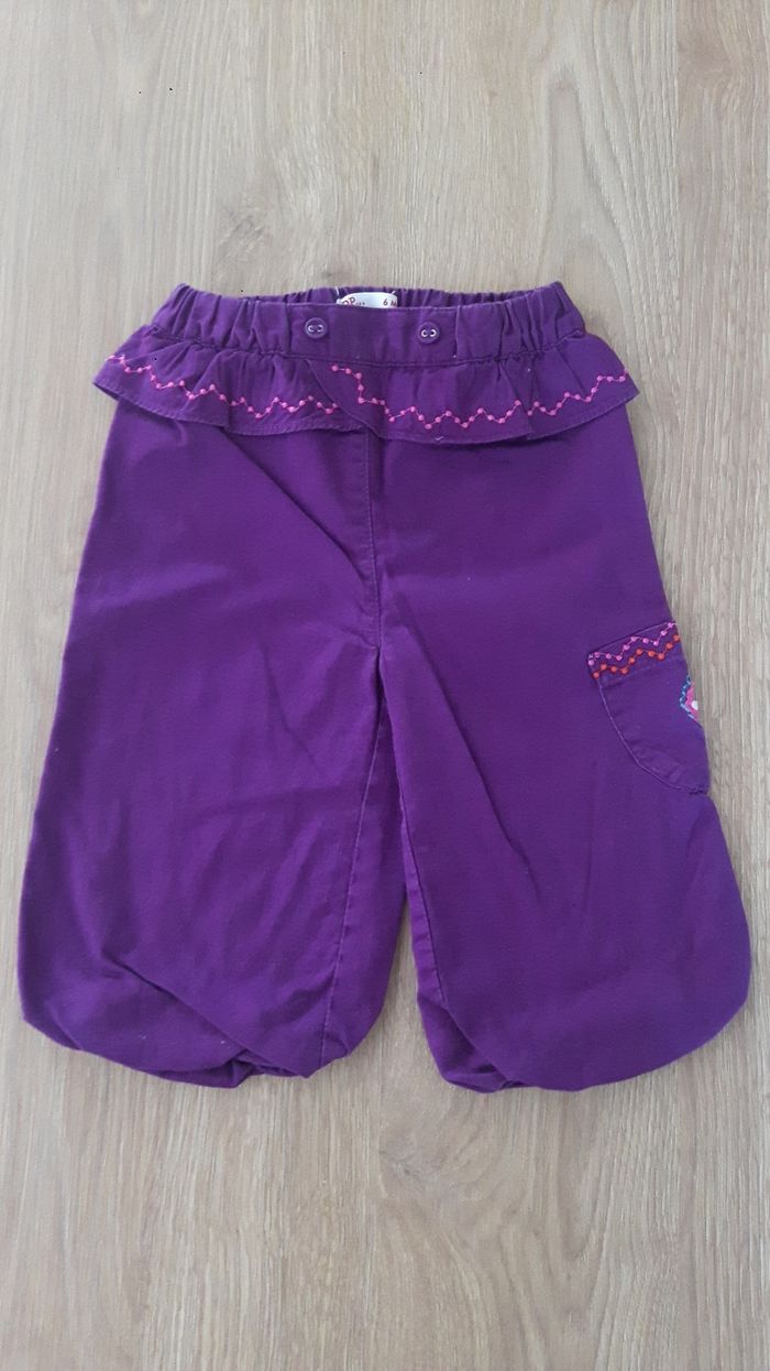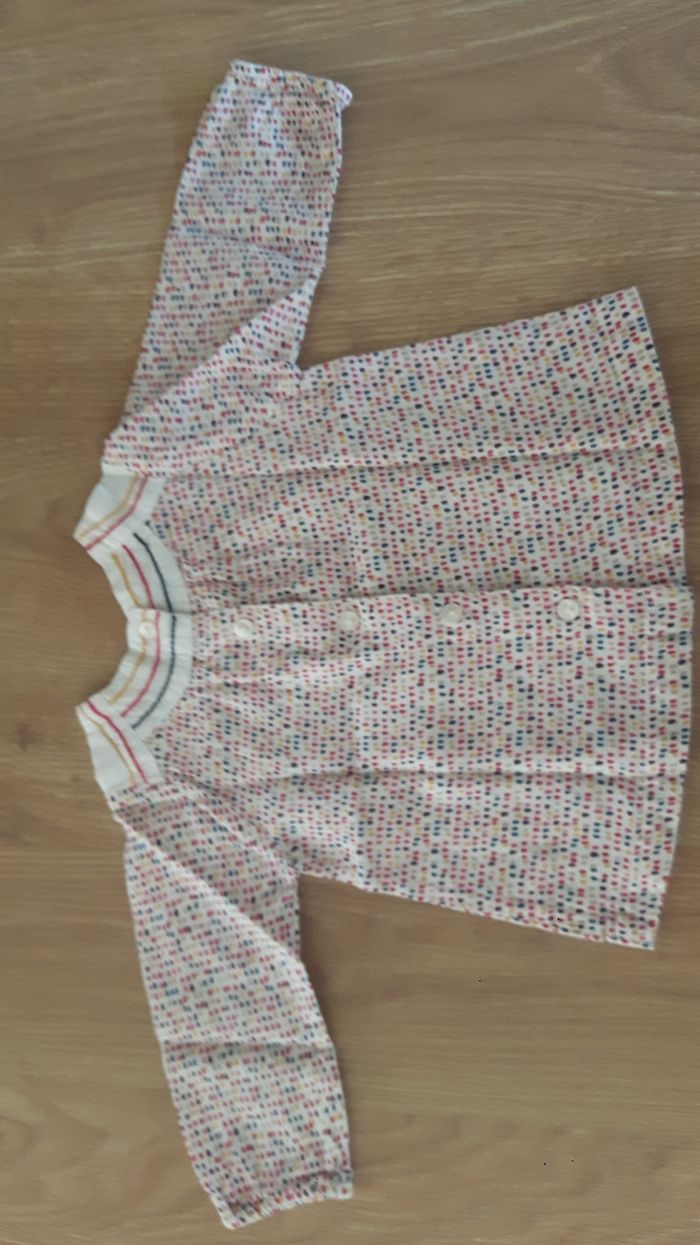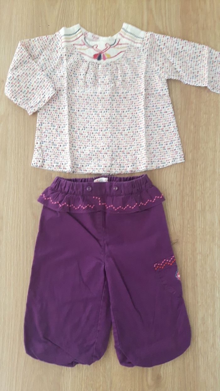 Très joli ensemble pour la mi saison, fille 6 mois. Marque DPAM En excellent état. Le pantalon est agréable, taille élastique, un peu bouffant, resserré aux chevilles. Joli couleur et collerette. La chemise sur ouvre à la arrière par des boutons. A manches longues, mais légère. Très jolis motifs assortis.