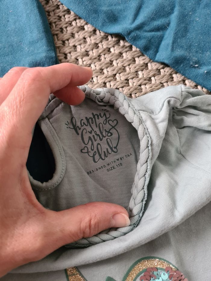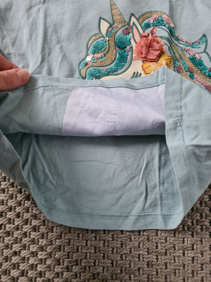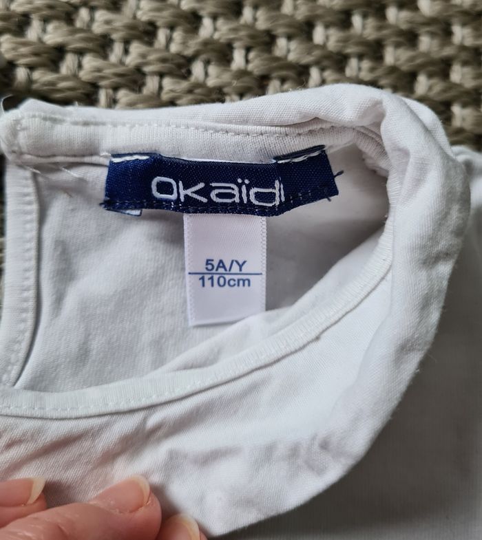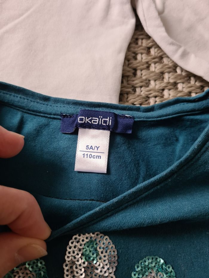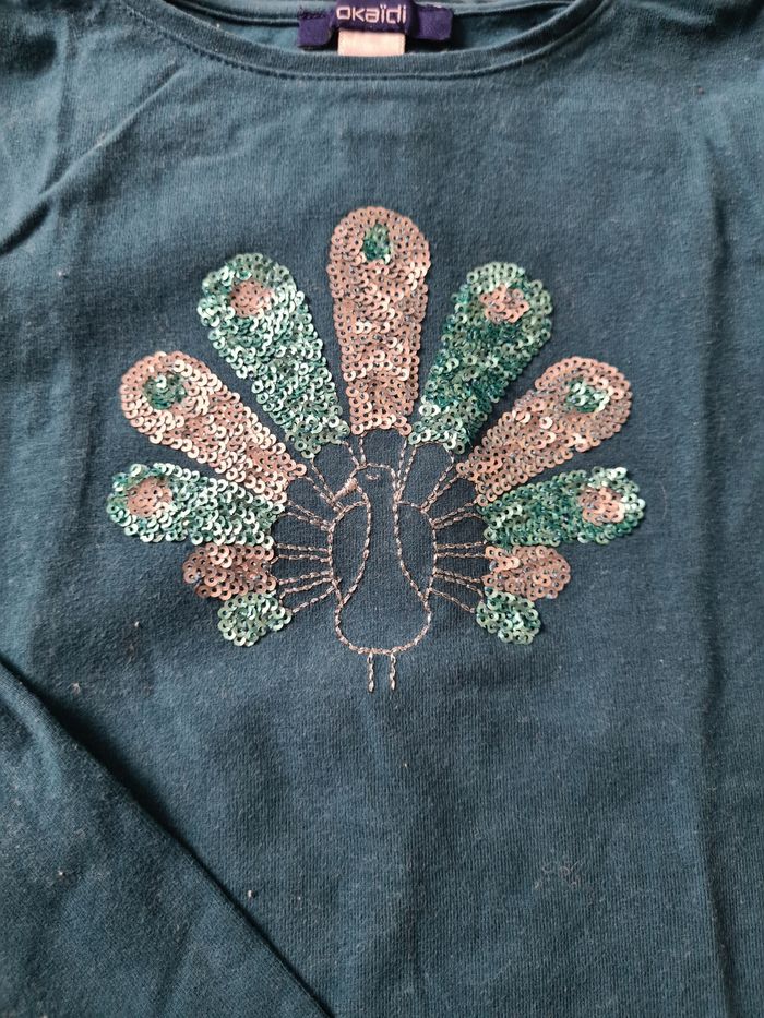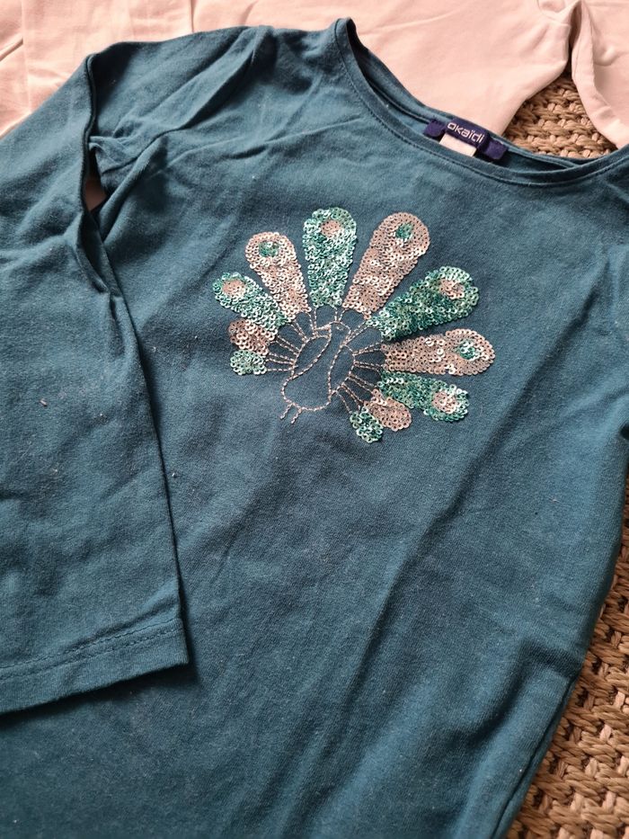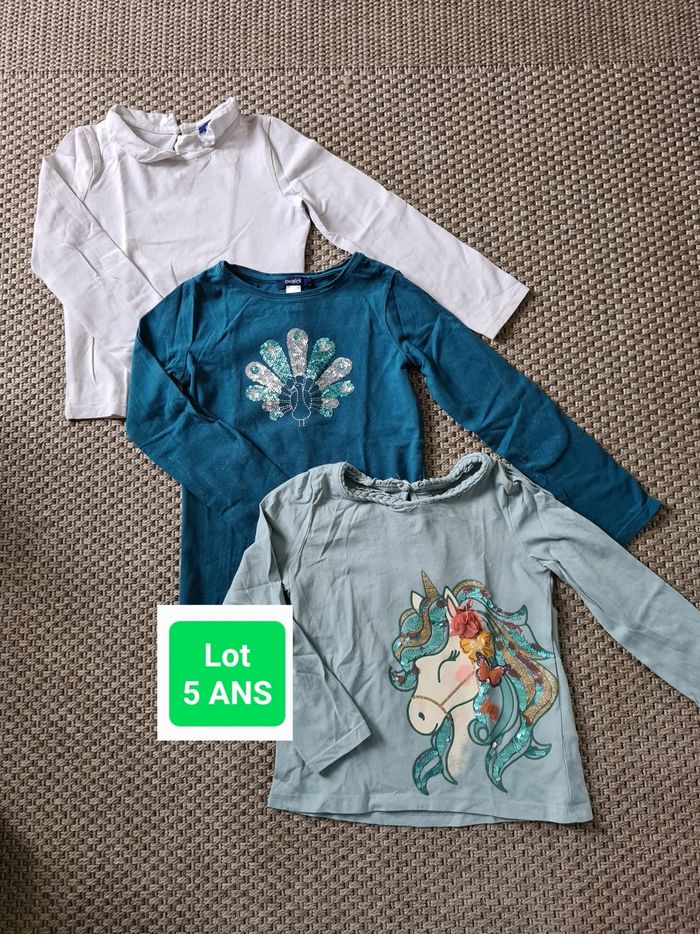 Lot de 3 T-shirts manches longues 5 ans portés en mais en bon état. - 1 bleu clair licorne à sequins - marque C&A - 1 bleu turquoise Paon à sequins - marque Okaïdi - 1 blanc avec col - marque Okaïdi