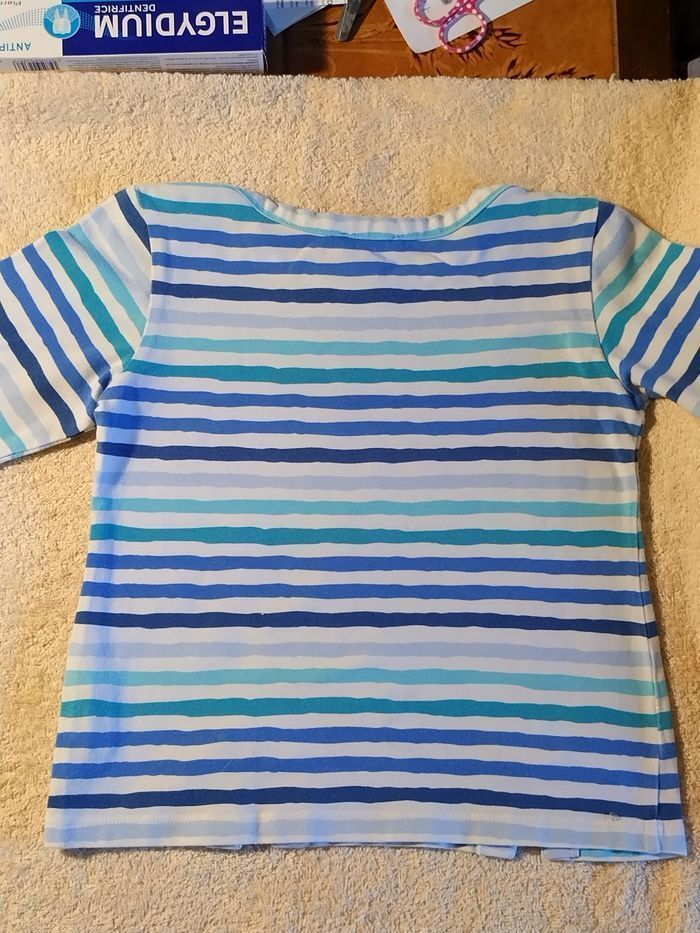 Joli t-shirt type marinière aux tons bleu, bleu ciel et turquoise de la marque KENZO pour une petite fille de 3-4 ans (c'est écrit 5 ans mais elle taille petit). Il est essentiellement en coton. Ce t-shirt est en bon état général. Pas de tâche ni de trou. Aisselle à aisselle : environ 31,5/32 cm. Épaule au bas du t-shirt : environ 38 cm.