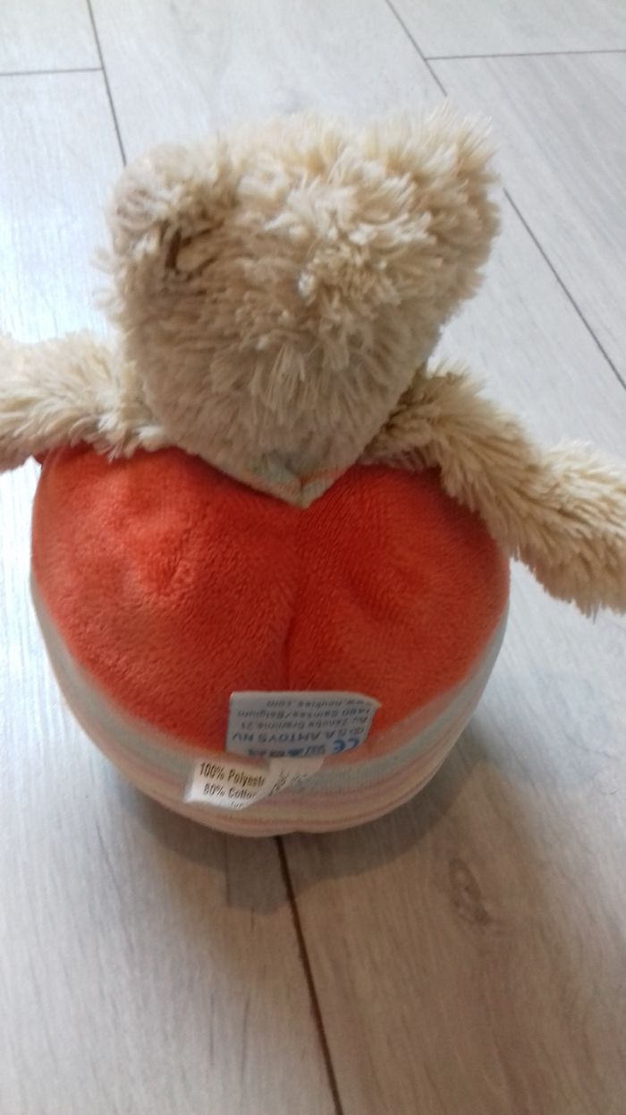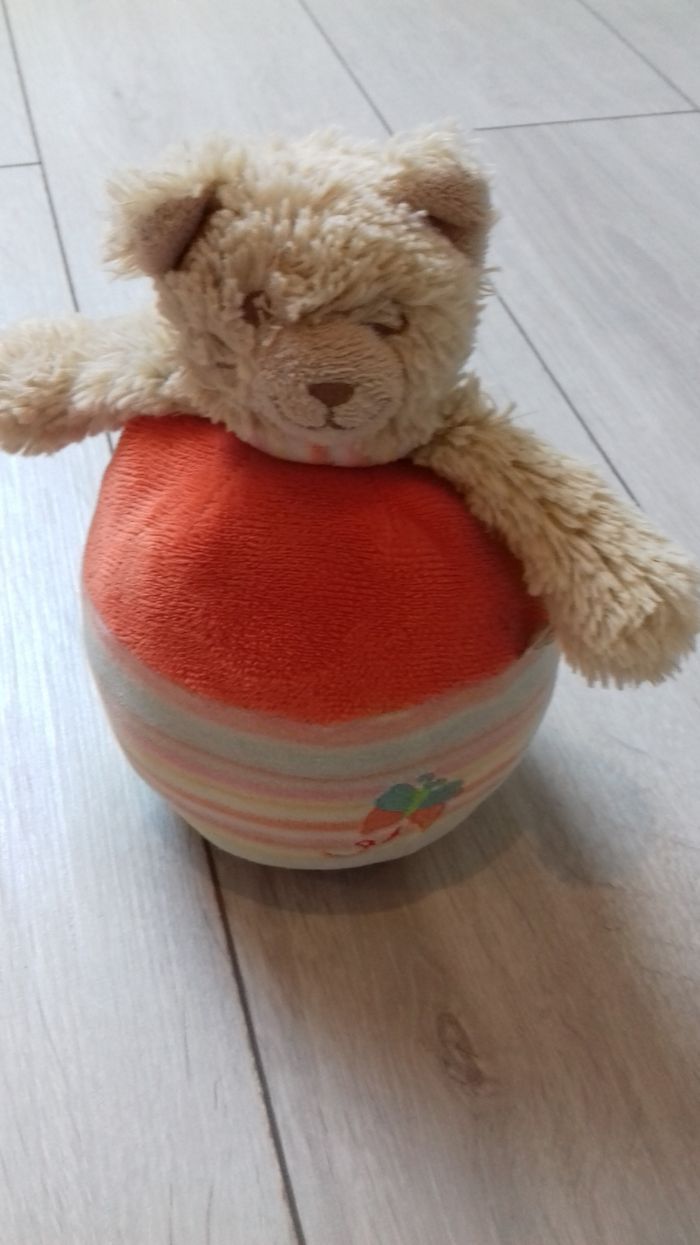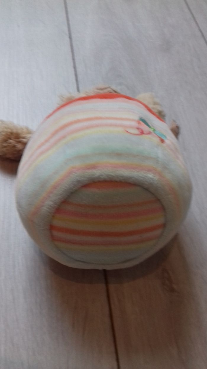 Hochet en peluche en forme de boule et d'ours. Grelot à l'intérieur.