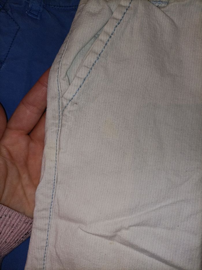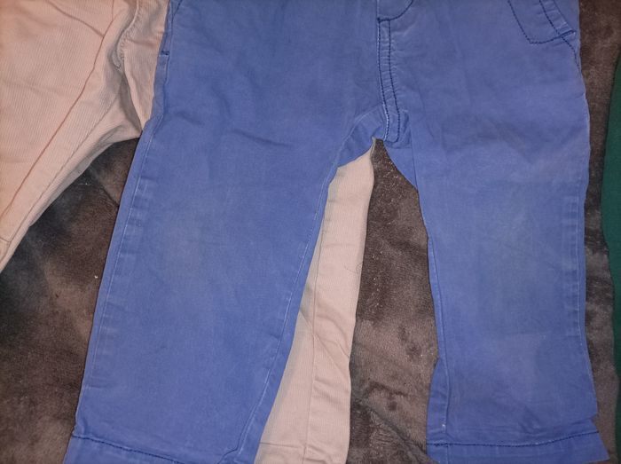 Lot de pantalons - bleu IKKS je pense 12mois (pas noté sur l'étiquette) petite décoloration aux genoux - trois autres pantalons (gris, vert et bleu ciel) 18mois de différentes marques. Le bleu ciel a deux petites tâches au niveau de la poche. Bon état