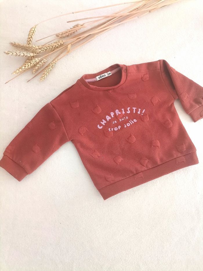 Sweat marron a col rond de marque Gemo taille 6mois (taille plutôt grand) 🐱 Avec un adorable message imprimé en rose "Chapristi je suis trop jolie" 🐱 Avec des boutons à pression sur l'épaule pour faciliter l'habillage, ce qui est un vrai atout à cet âge ! 🐱 Avec de jolis reliefs "tête de chats" Parfait pour la mi-saison, en excellent état.