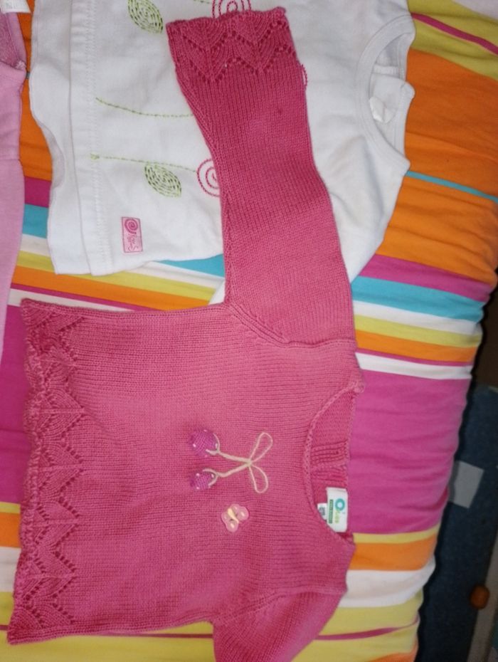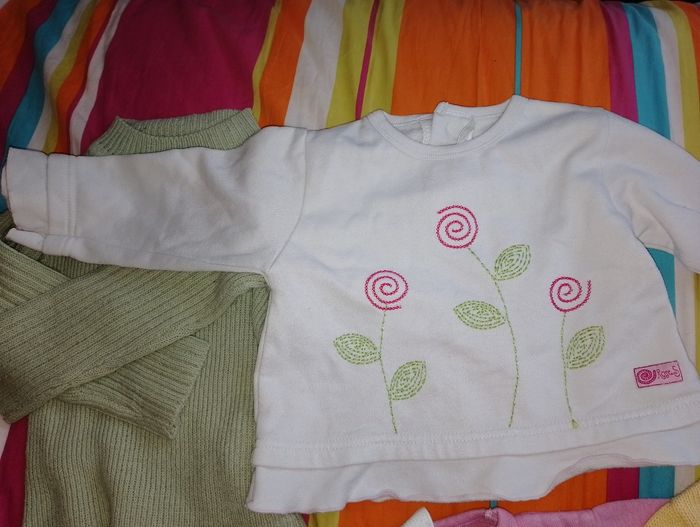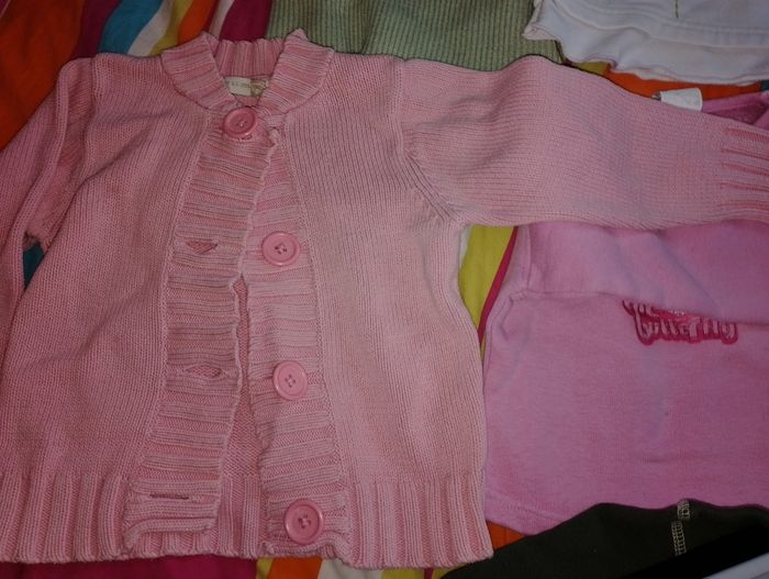 Pull gilet 24 mois 4 euro pièce 25euro le tout * Pull vert col miss gyla avec petite fille rose * Pull blanc avec fleurs verte et rose 1 point noir à la manche * Pull rose avec cerise o'kids Verbaudet * Gilet rose tape à l'oeil * Pull rose touche thé butterfly papillon (1 micro tâche bleu sur le devant) * Jaune avec fleurs kimbaloo * Vert à capuche Okaïdi avec 1 accro a l'arrière