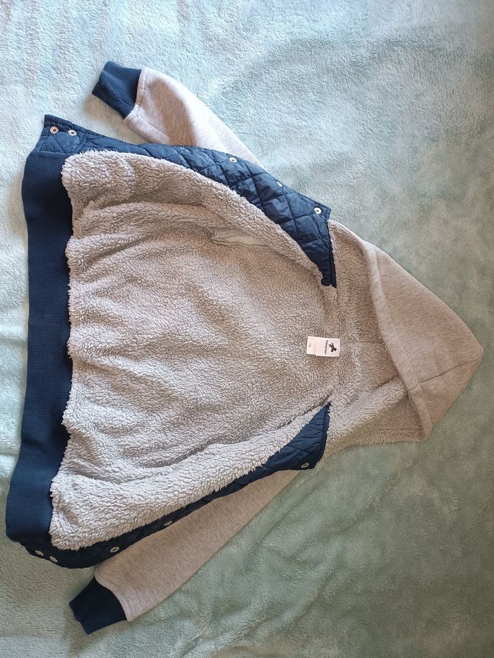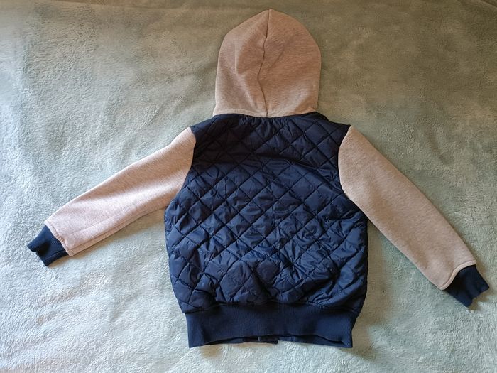 Envoi uniquement par Mondial Relay Je vends un manteau à capuche mi-saison de chez C&A, de taille 116, bleu marine et gris Sans poches et fermeture à pression Manches et capuche matière sweat et intérieur chaud Étiquette coupée mais manteau en excellent état