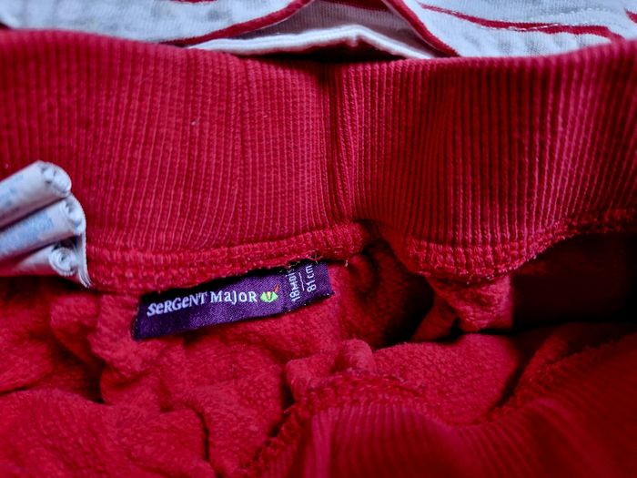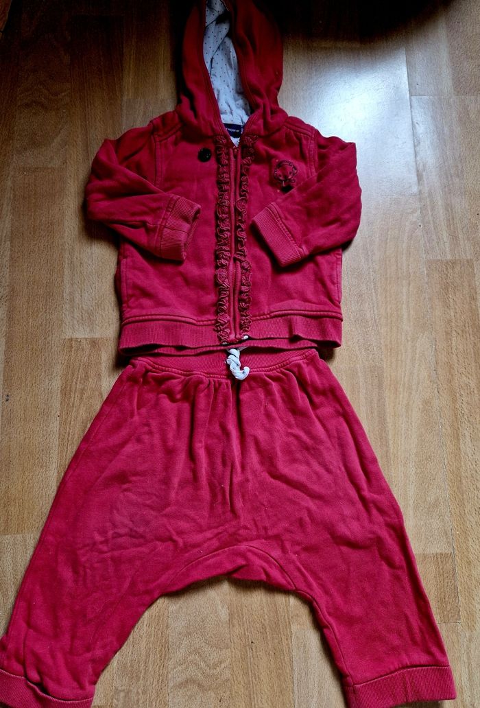 Ensemble 3 pièces jogging rouge avec: - Pantalon ajustable, - tee shirt boutons pression - Veste à capuche et fermeture éclair Mis mais en bon état !
