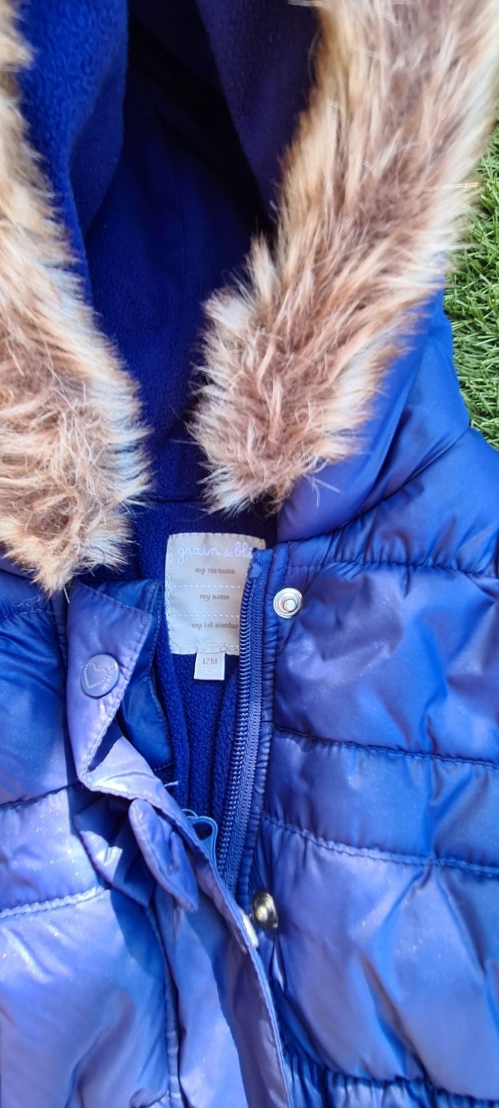 Doudoune bleu avec un peu de paillette capuche avec fourrure, doublé polaire taille 12mois.
