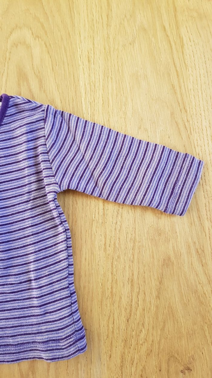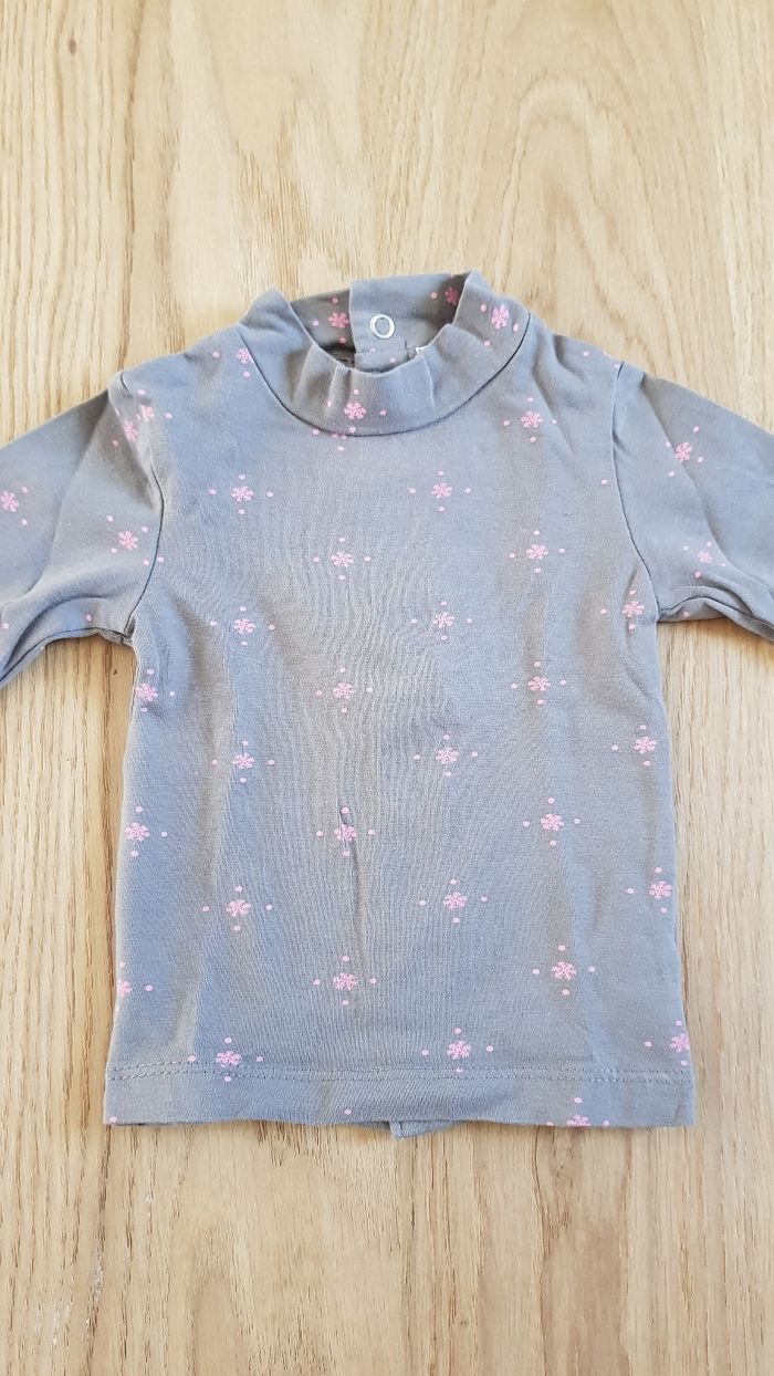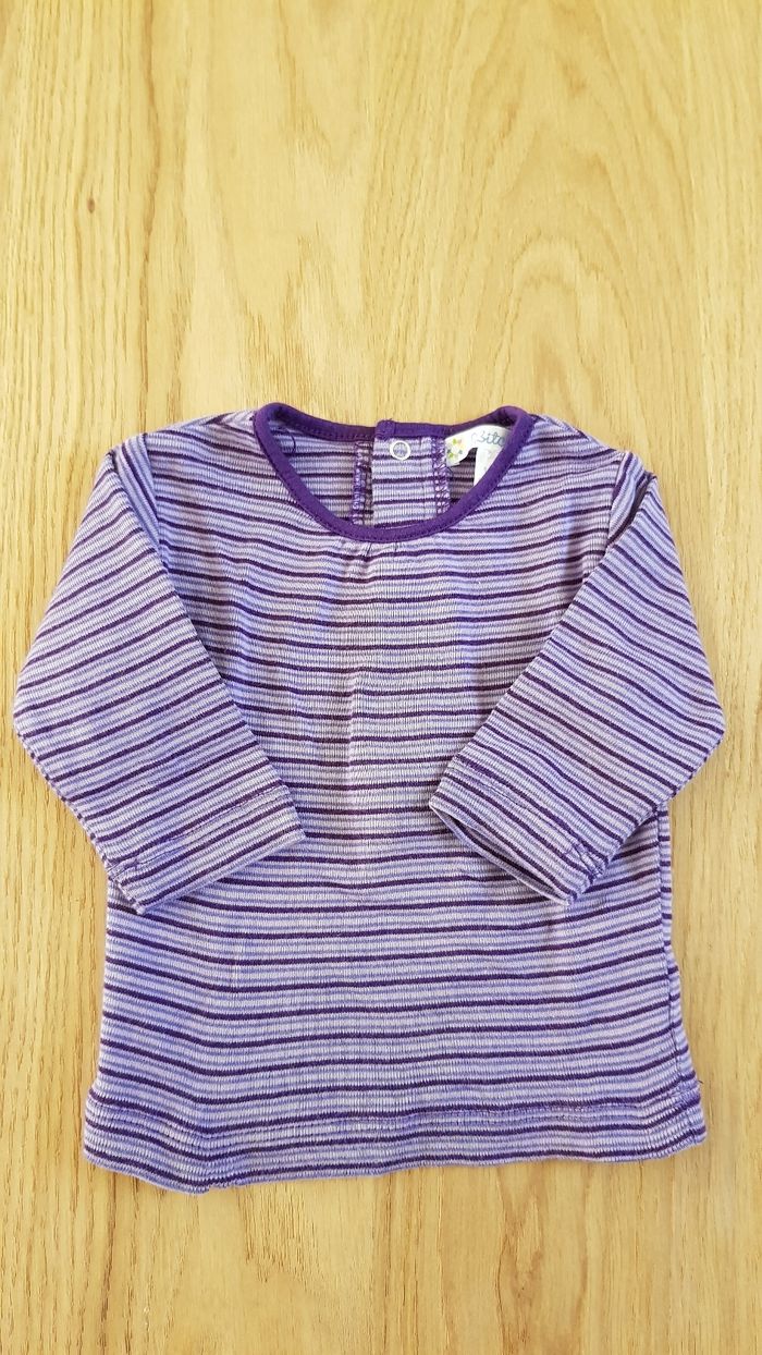 Lot de 2 tee-shirt bébé Kitchoun taille 1 mois 1 tee-shirt col rond à rayures violet et lila et 1 tee-shirt motif flocon de neige avec col roulé gris et rose Excellent état Envoi rapide et soigné via diverses plateformes