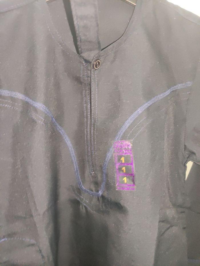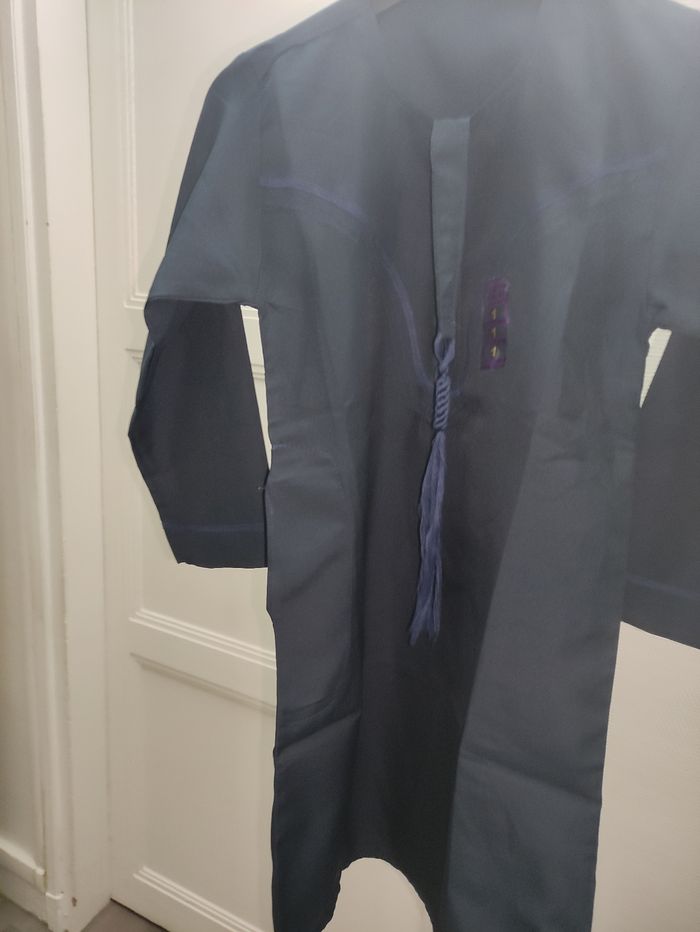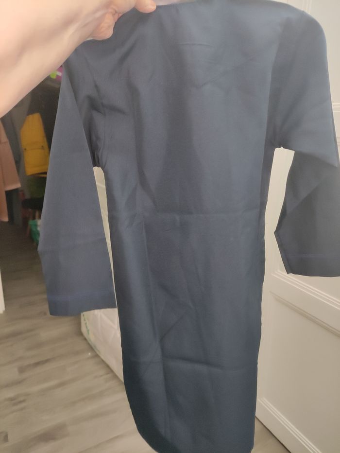 Robe Couleur bleu marine Manches longues Bouton au col pour fermer Jolie bande avec pompon qui descend devant Taille 5/6 ans