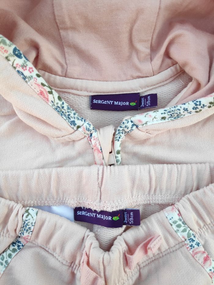 Joli petit jogging rose Sergent Major 3 mois/59 cm, en très bon état. Tissu un peu molletonné, ceinture élastique avec cordon de serrage. Très mignonne petite tenue!