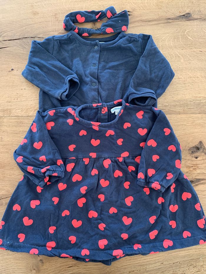Ensemble vertbaudet 12 mois avec son gilet et bandeau assorti, les motifs cœur ont légèrement craquelés au fils des lavages mais reste en très bon état.