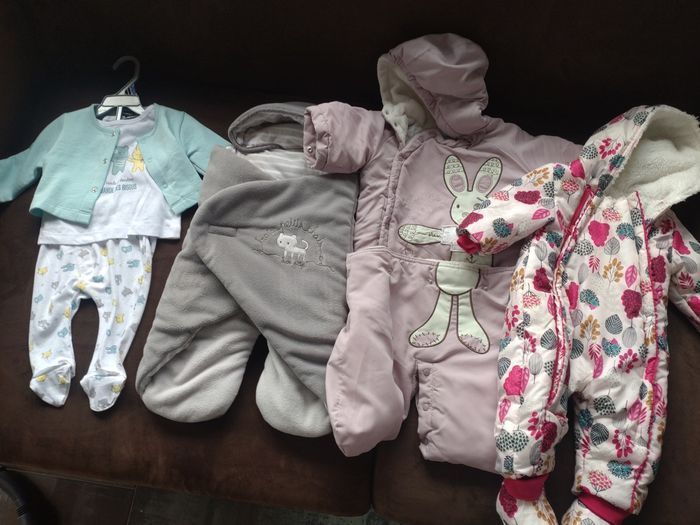 Vends 1 nid d'ange sucre d'orge 0/6 mois, un ensemble 3 mois neuf , une combinaison Verbaudet 2/3 mois et une combinaison catimini 3 mois