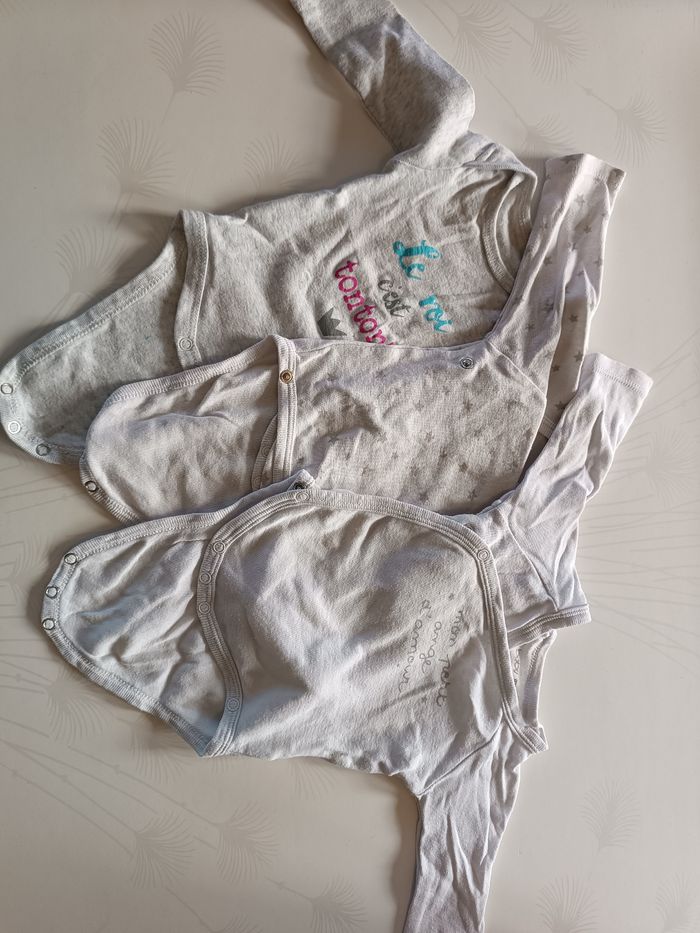 3 bodies manches longues très bon état 2 : ouverture par le devant et 1 : en passage par la tête avec noté "le roi c'est tonton" Très bon état
