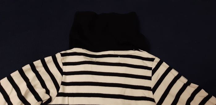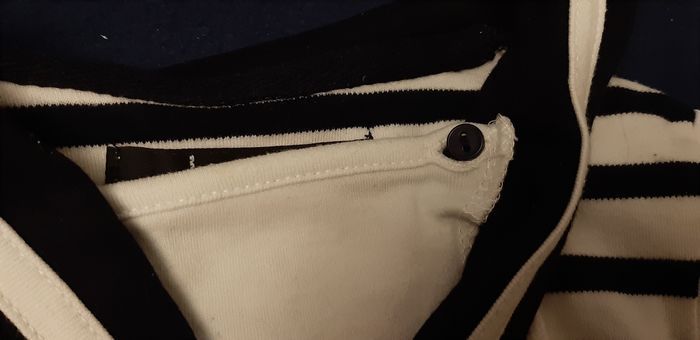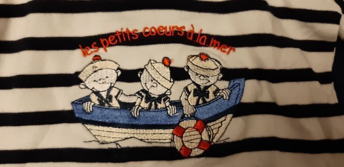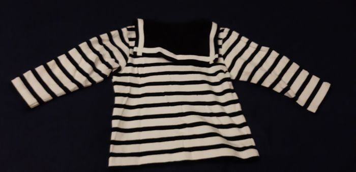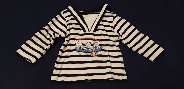 Tee-shirt marin en 18 mois. Sailor. Le tissu blanc, avec le petit bouton de la photo 5, c'est d'origine. Mais je ne vois pas l'utilité. Neuf, jamais mis. Non repassé.